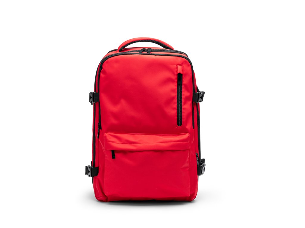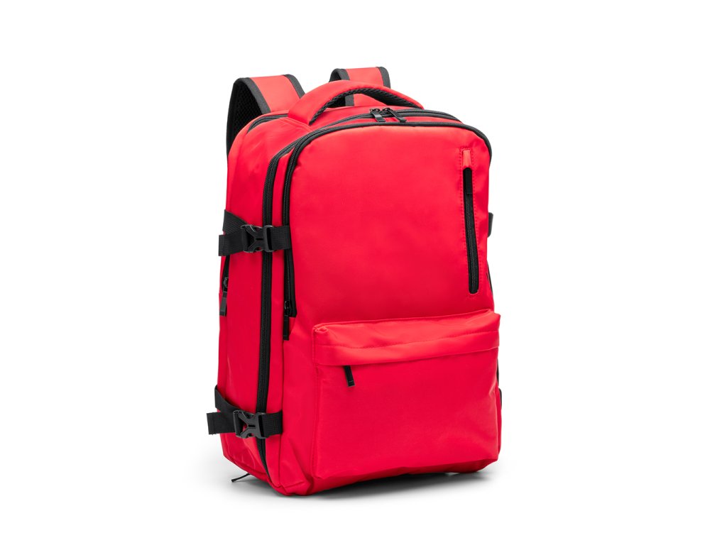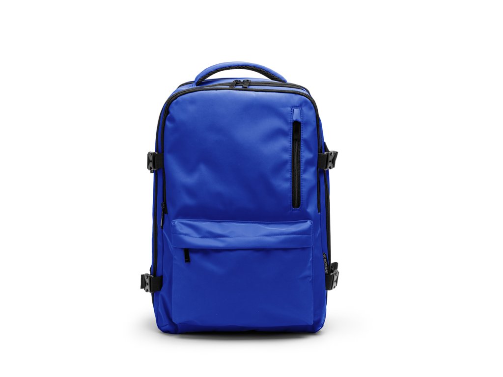 Voděodolný palubní batoh z RPET polyesteru. Prostorná hlavní přihrádka na oblečení a kapsa na 16" notebook. Přední kapsa s voděodolnou podšívkou a zadní bezpečnostní kapsa. Polstrované ramenní popruhy a záda. Popruh na zavazadlo.