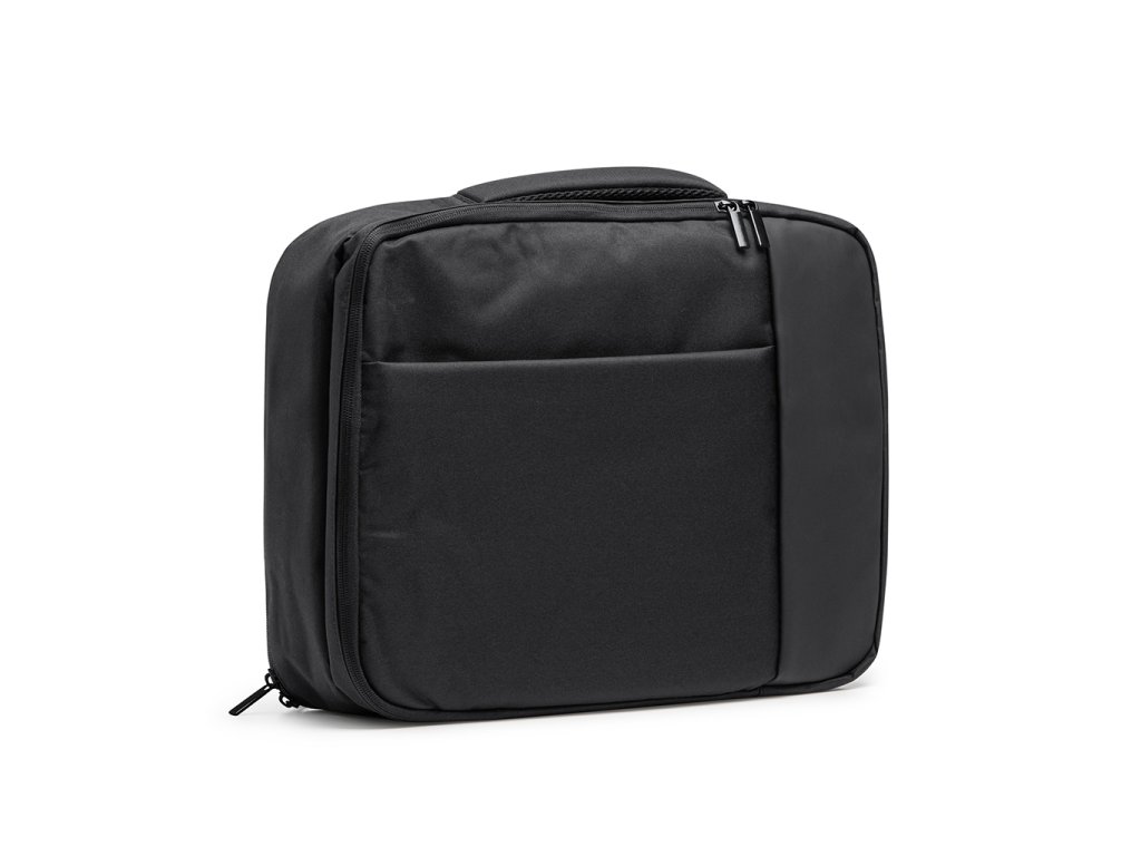 Cestovní batoh pro manažery z polyesteru 300D. Dvě hlavní polstrované kapsy s vnitřními přihrádkami a kapsami ideálními pro notebook nebo tablet. Polstrovaná záda a ramenní popruhy. Popruh skrývající kapsu a popruh na vozík.