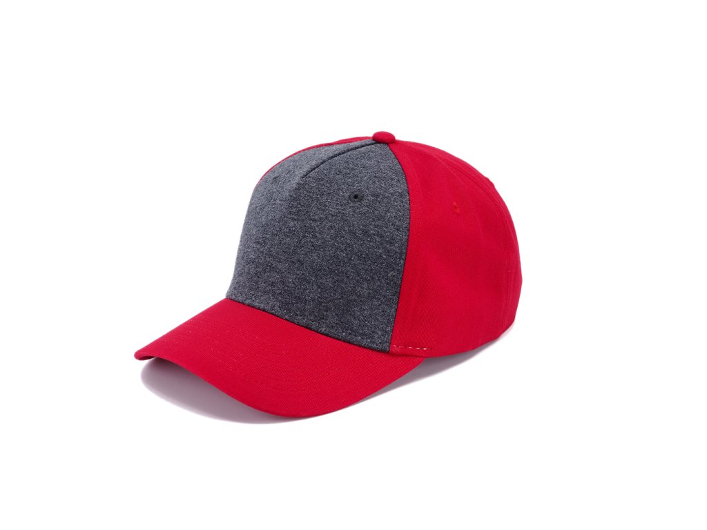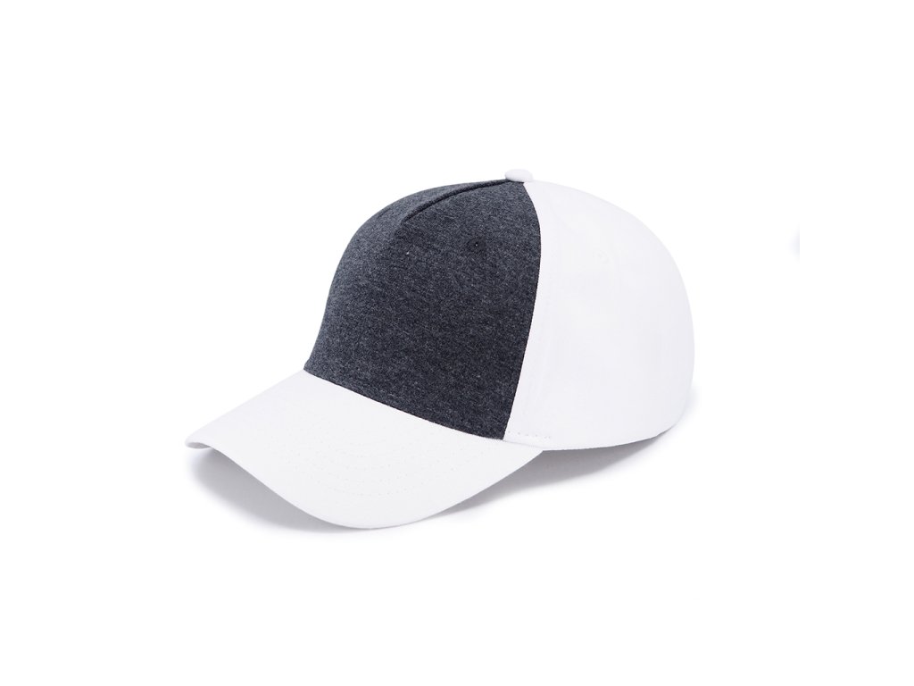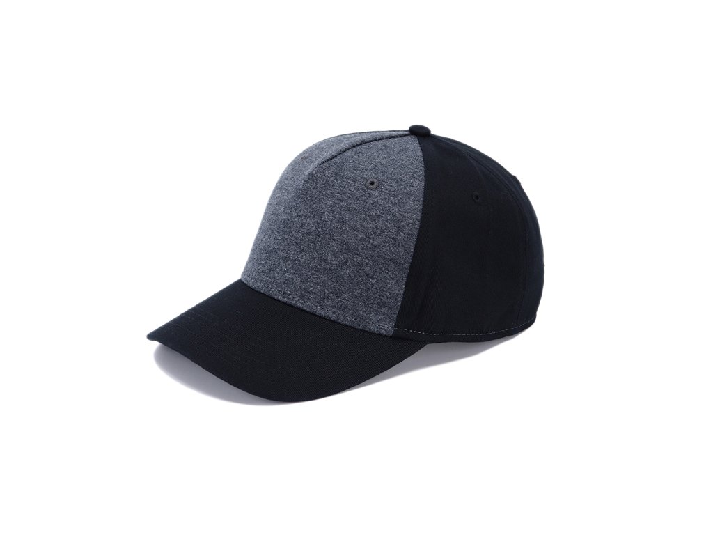 Pětipanelová čepice s předním panelem z látky s melírovým efektem. Bavlněný potící pásek, obšité větrací otvory a zapínání na kovovou sponu.
