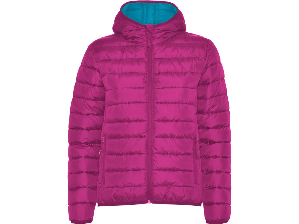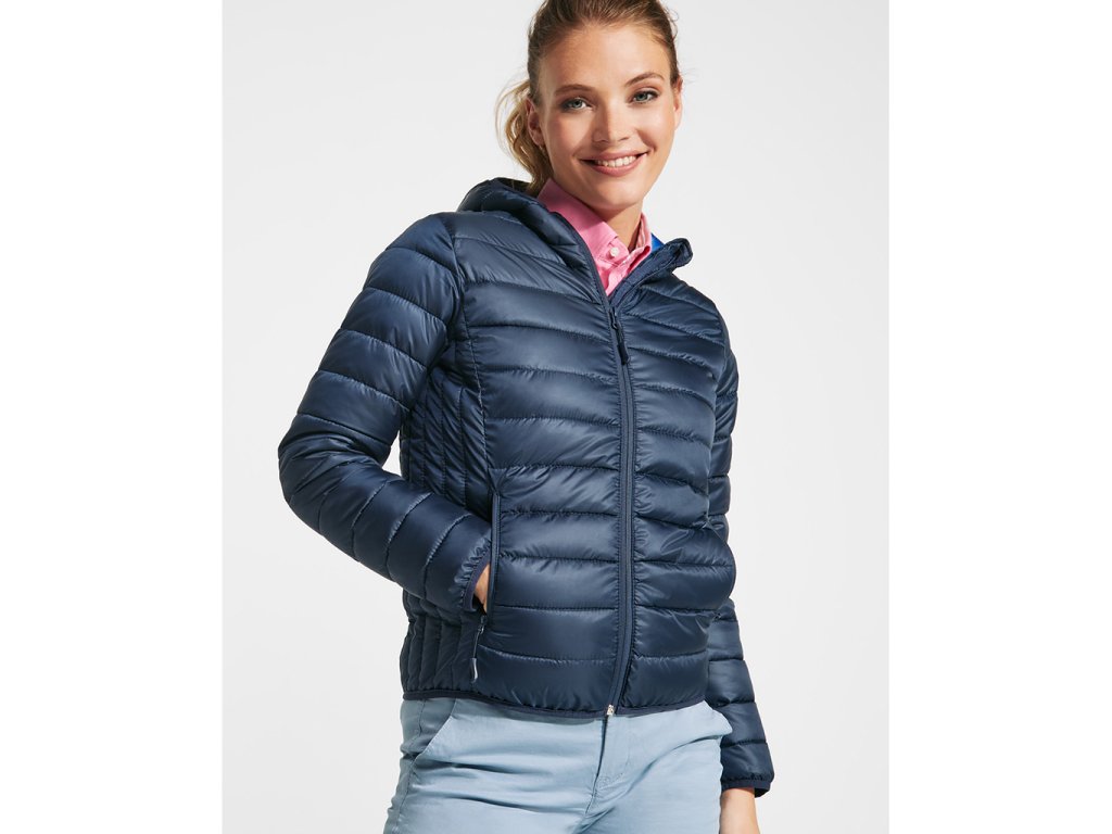 Dámská prošívaná bunda s kapucí. Větru a voděvzdorný materiál. Má celopropínací zip s krytkou jezdce, dvě boční kapsy na zip, lemování kapuce, manžety a spodní lem ve stejném tóne.Podšívka je v kontrastní barvě. Lehký oděv s možností složení. Vypasovaný střih.