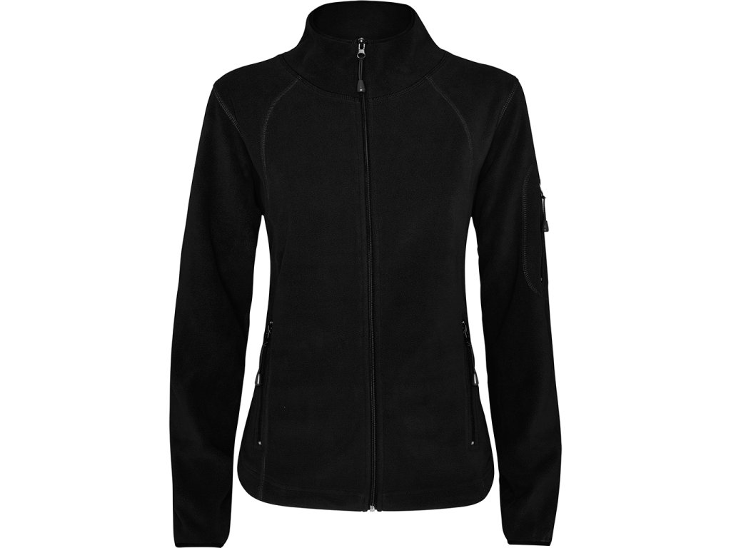 Dámská mikrofleecová sportovní bunda s vysokým límcem, dlouhým rukávem s lemováním v kontrastní barvě. Celolpropínací zip. Boční kapsa a kapsa na levém rukávu na zip. Prošívání na bočních stranách a na hrudi. Nášivka na lokti ze stejného materiálu.