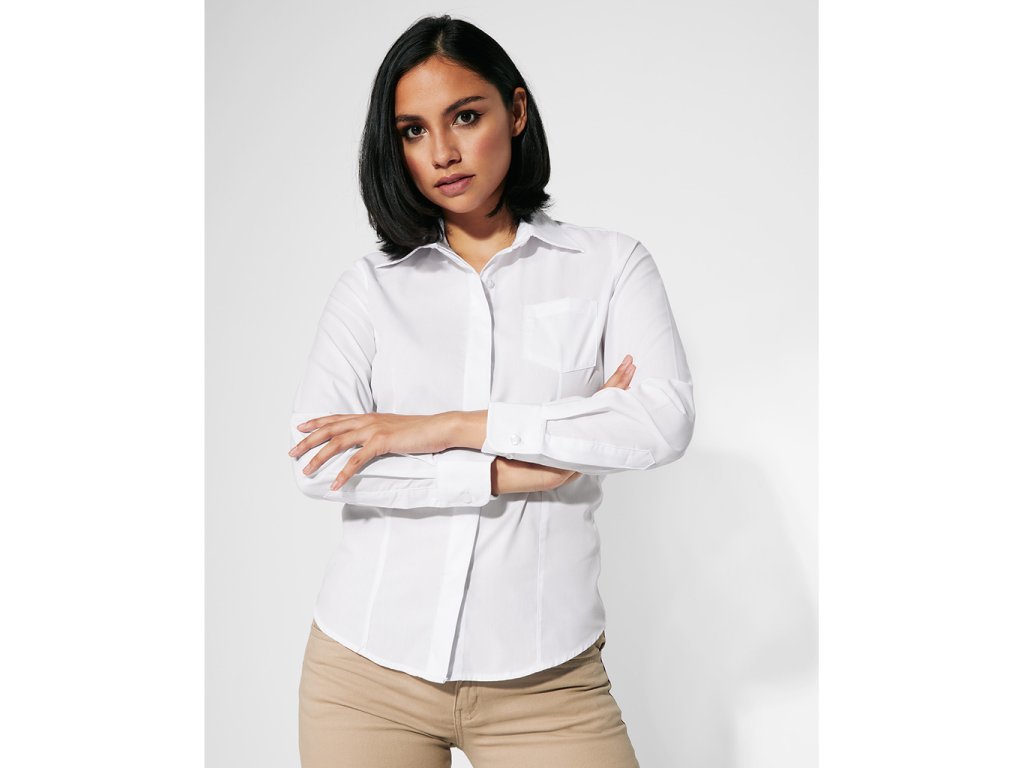Dámská košile s dlouhým rukávem. Košile má klasický límec s 1 knoflíkem a náprsní kapsu na levé straně. Zapínání na sedm knoflíků v barve košile. Tvarovaný dolní kraj, jednoduchá údržba.