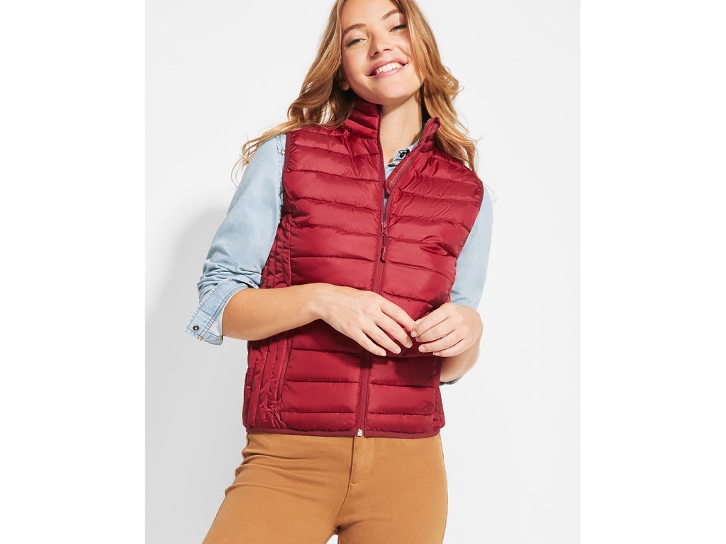 Dámská prošívaná vesta. Vesta má celopropínací zip s krytkou jezdce, dvě boční kapsy na zip, podšívku v kontrastní barvě a elastický spodní lem ve stejné barvě. Lehký oděv s možností složení. Vypasovaný střih.