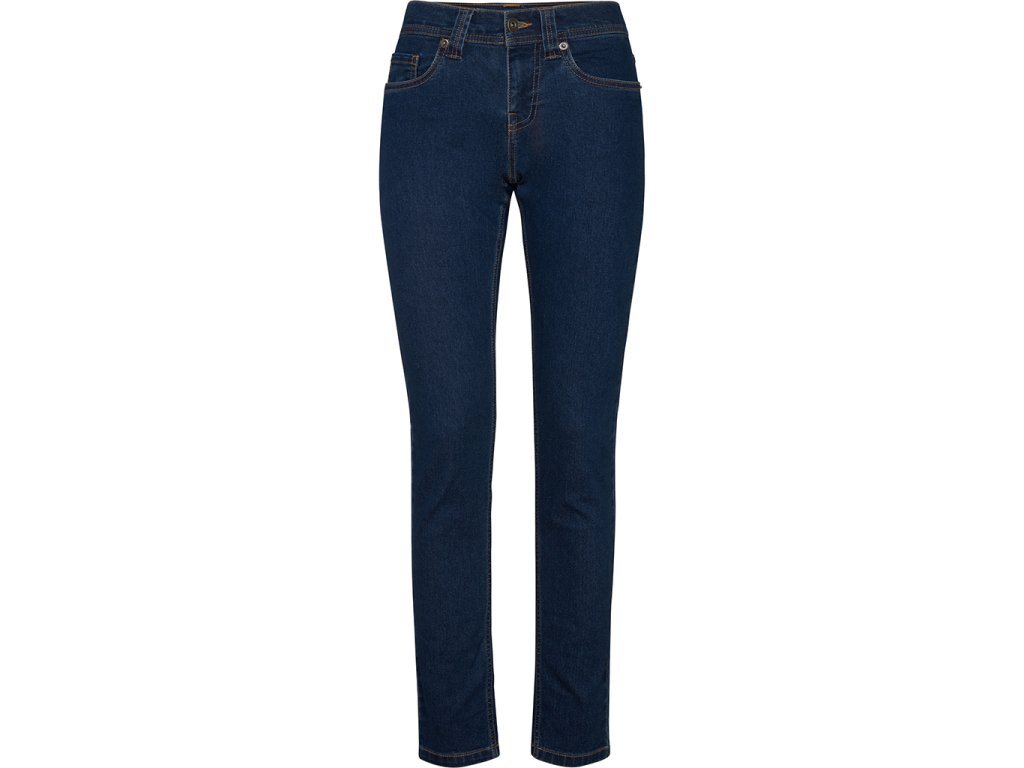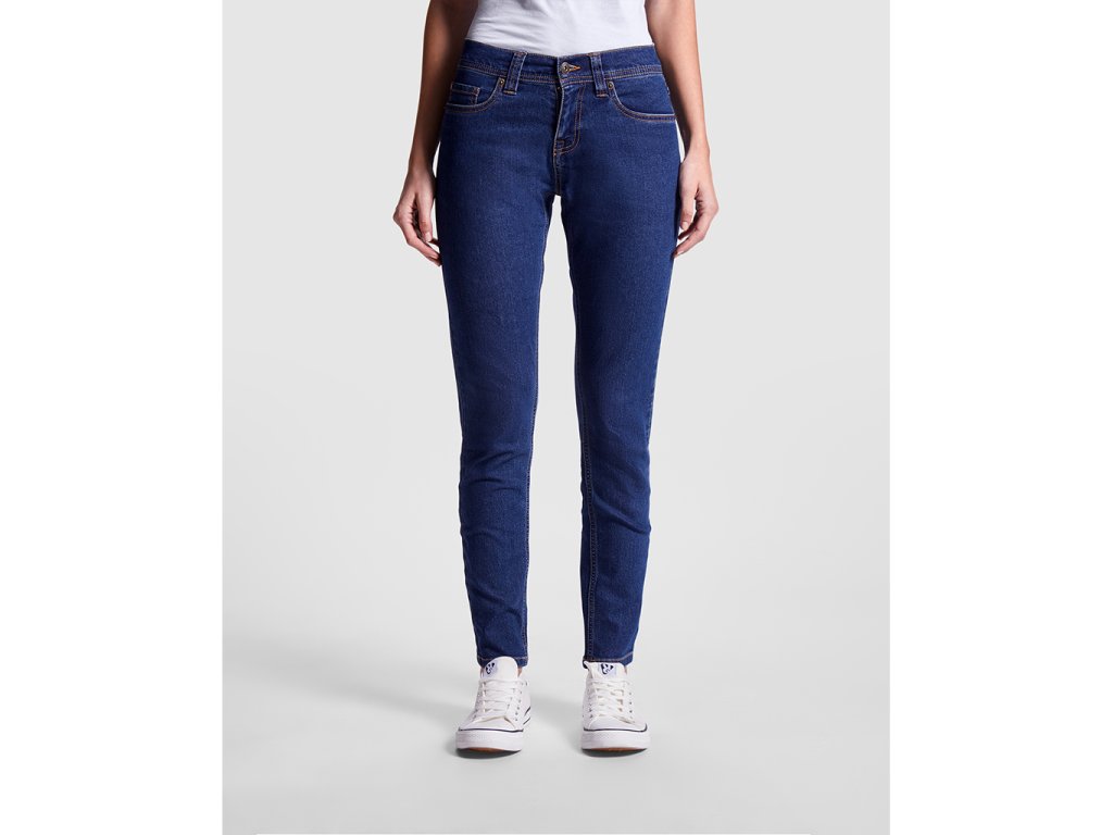Dámské džíny. Regulérní střih a středně vysoký pas. Pas s pěti poutky. Zapínání na kovový zip. Dvě přední kapsy a kapsa na mince. Dvě zadní kapsy. Polopřiléhavý střih z elastické tkaniny.