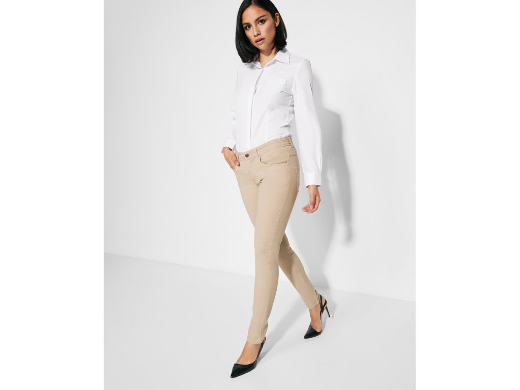 Dámské dlouhé kalhoty z odolného materiálu, velmi pohodlné, džínový design. Kalhoty mají dvě boční kapsy+kapsu na mince na pravé kapse, dvě zadní kapsy a poutka na pásek.