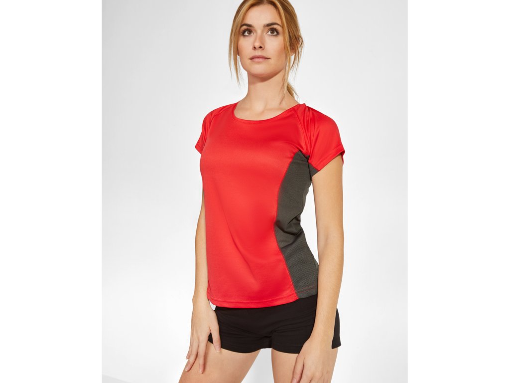 Dámské funkční triko s krátkým rukávem. Kombinace dvou polyesterových tkanin. Hlavní materiál: 100% polyester-honeycomb, boční panely: 100% mikroperforovaný polyester. Raglánové rukávy. Kulatý výstřih, zpevněné švy na průkrčníku. Pohodlné a snadno přizpůsobivé.