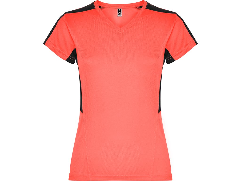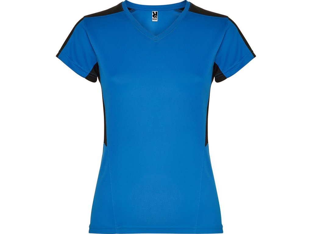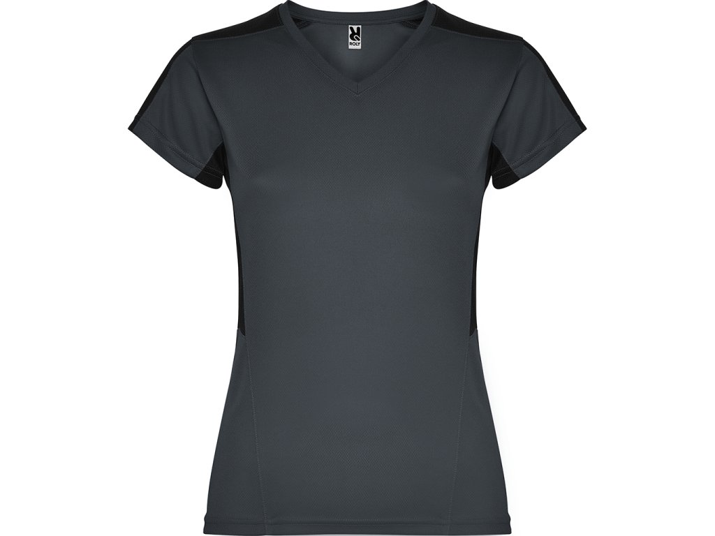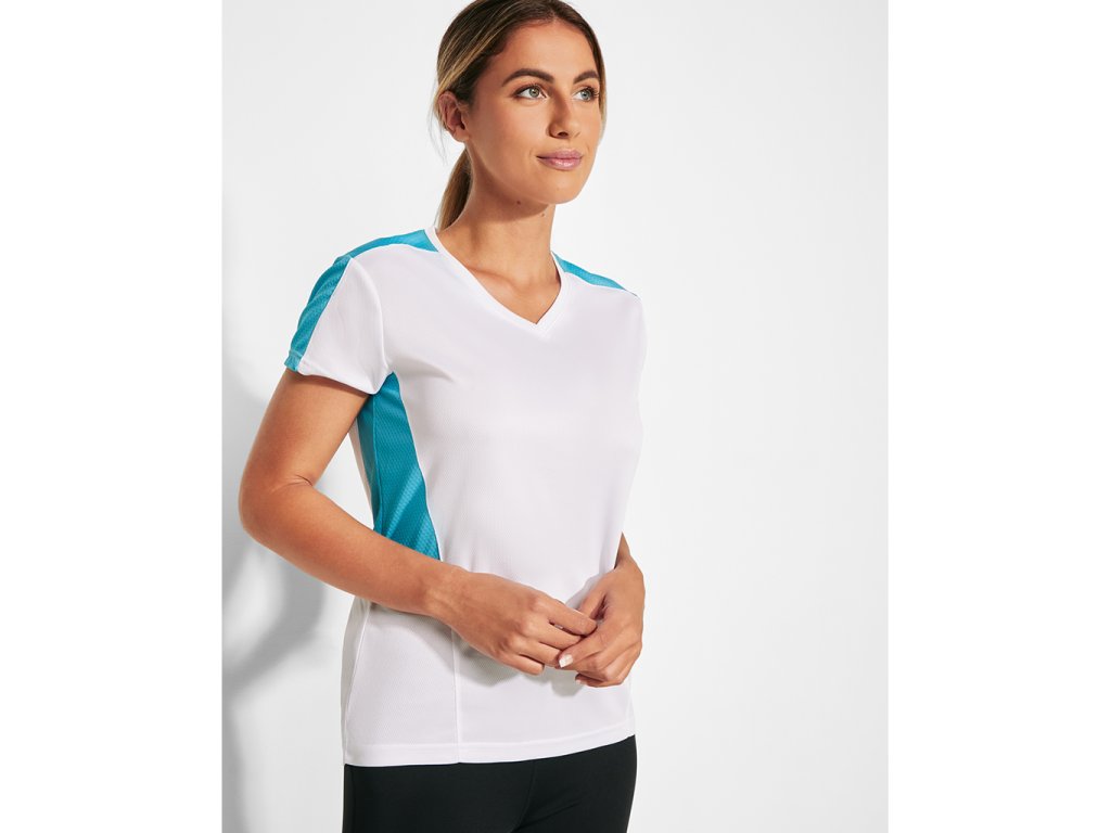 Dámské funkční triko s krátkým rukávem a výstřihem do V. Kombinace dvou polyesterových tkanin. Hlavní materiál polyester honeycomb a polyester 3D mřížky na ramenou a bočních vsadkách. Materiál dobře absorbuje vlhkost.