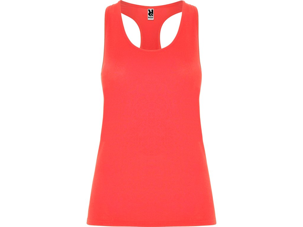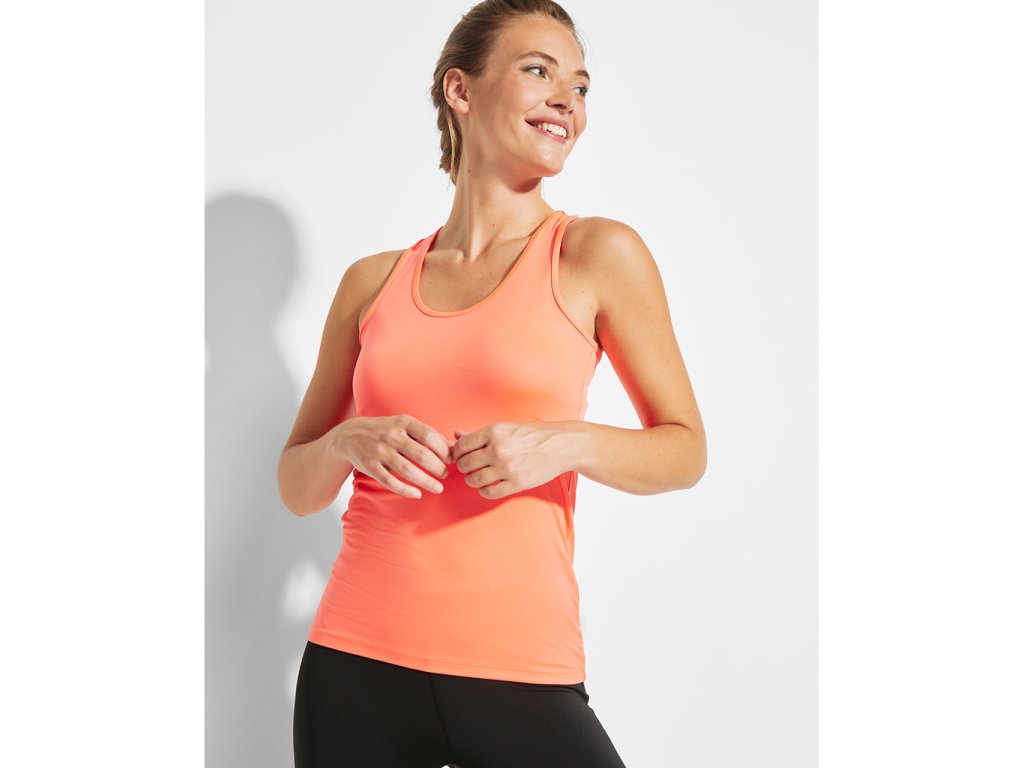 Sportovní dámské/dívčí tílko s kulatým výstřihem a se zadním vykrojením v plaveckém stylu. Vyrobeno z polyesteru, na omak materiál působí jako bavlna. Přiléhavý střih.