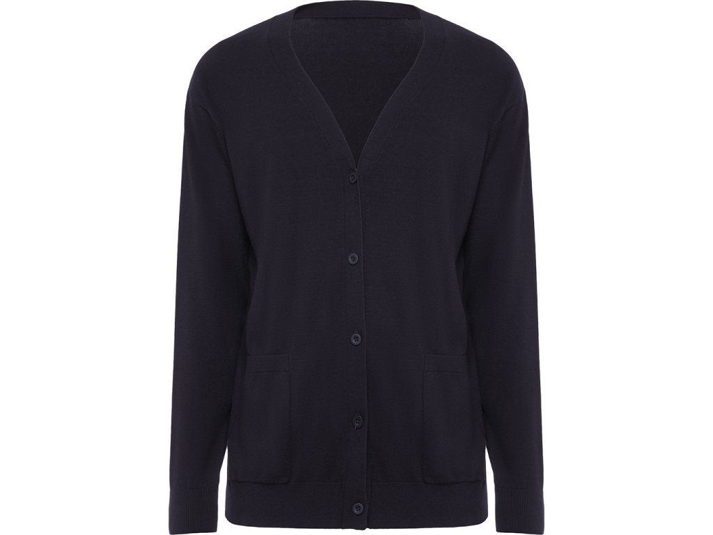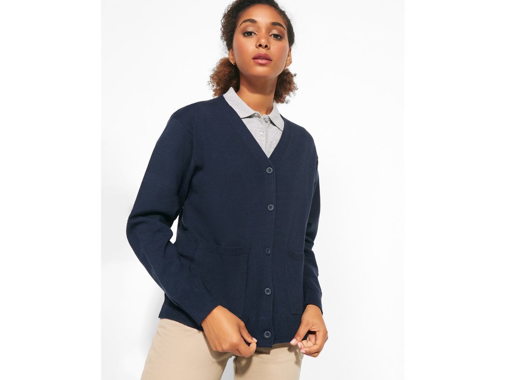 Dámský svetr s výstřihem do V z měkké prošívané látky. Svetr má přední zapínání na pět knoflíků ve stejné barvě svetru, dvě kapsy, manžety a elastický pas z žebrované látky.