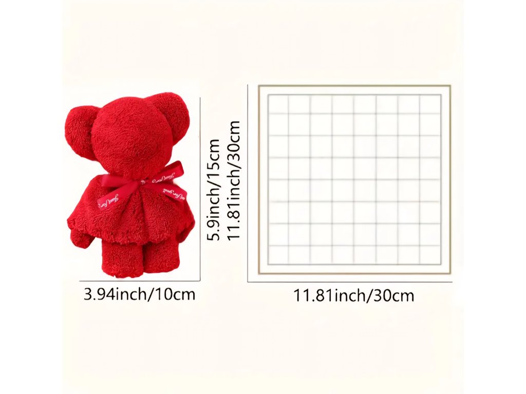 Dárek 2v1: Slouží jako roztomilá dekorace ve tvaru medvídka (velikost složeného medvídka je cca 15 x 10 cm) a po rozložení jako plně funkční čtvercový ručník o velikosti 30 x 30 cm.