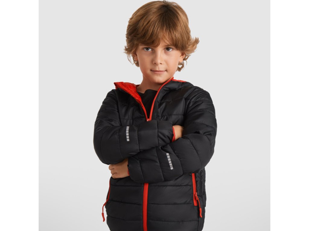 Pánská/dětská sportovní prošívaná bunda s výplní s péřovým efektem. Obrácený zip v kontrastní kombinaci s ochranou pro bradu a poutkem. Napevno přišitá padnoucí kapuce. Kontrastní postranní kapsy s obráceným zipem a poutkem. Reflexní detaily na rukávech a zadním díle. Střih lemu o 4 cm delší než u modelu NORWAY. Kapuce, manžety a spodní lem s elastickou kontrastní obrubou. Součástí přepravní taštička. Odnímatelný štítek. Model odolný proti větru. Nepromokavý. Vnější strana: 100% polyester, 300T. Podšívka: 100% polyester. Vatelín: 100% polyester, s péřovým efektem.