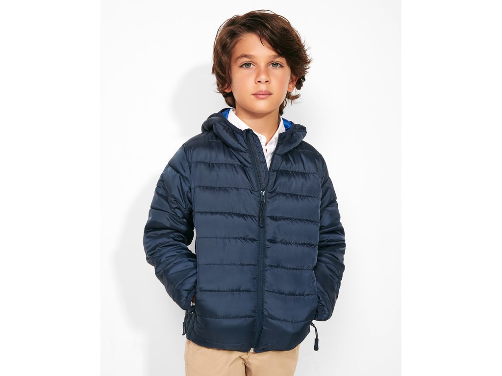 Prošívaná bunda s kapucí. Větru a voděvzdorný materiál. Má celopropínací zip s krytkou jezdce, dvě boční kapsy na zip, lemování kapuce, manžety a spodní lem ve stejném tónu. Podšívka je v kontrastní barvě. Lehký oděv s možností složení.