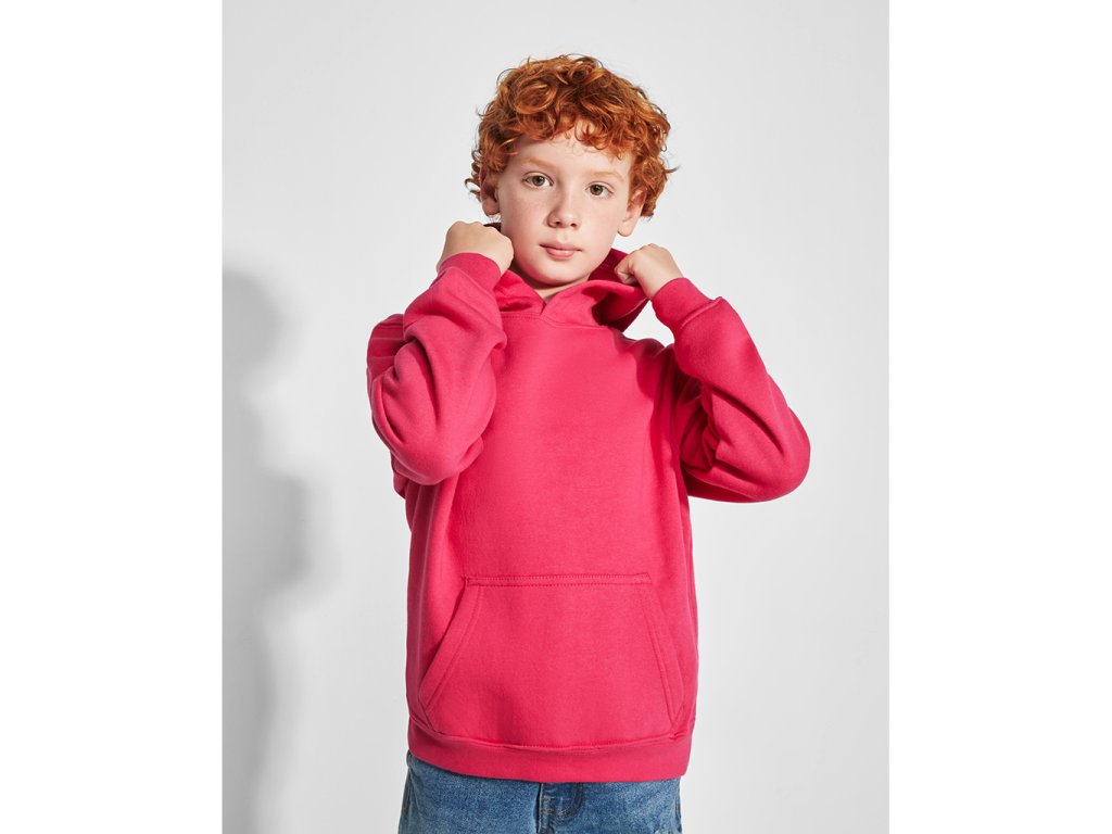 Mikina s kapucí a klokaní kapsou. Elastický průkrčník, lemování rukávů a spodního patentu v žebrovaném úpletu 1x1. UPOZORNĚNÍ-MIKINY V DĚTSKÉM PROVEDENÍ JSOU DODÁVÁNY BEZ ŠŇŮREK V KAPUCI.