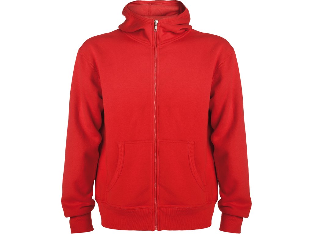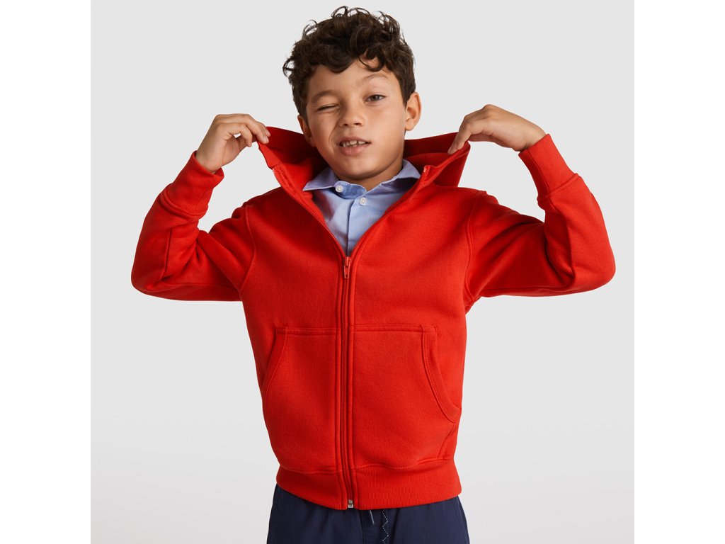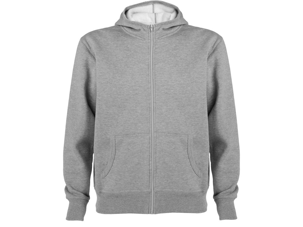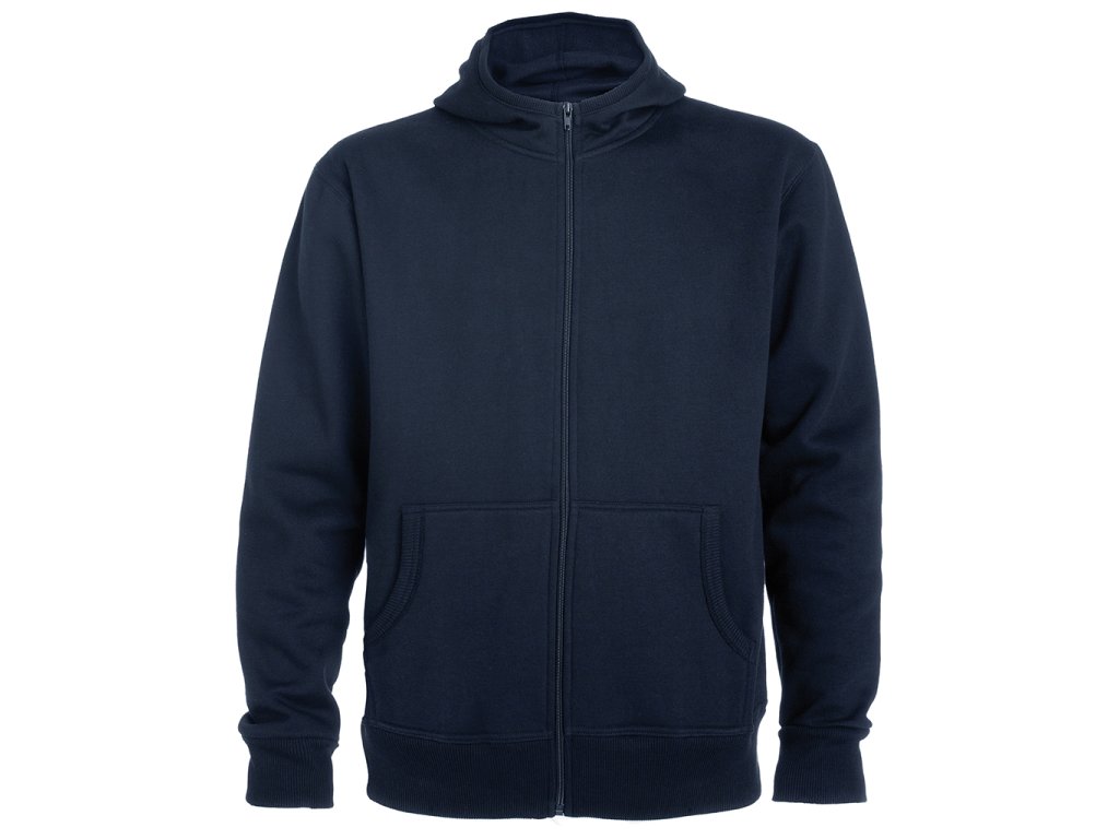 Mikina s kapucí a klokaní kapsou, celopropínací na zip. Lemování kapuce, kapes, rukávů a spodní okraj v žebrovaném úpletu 2x2.
