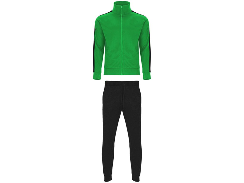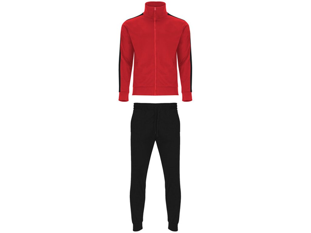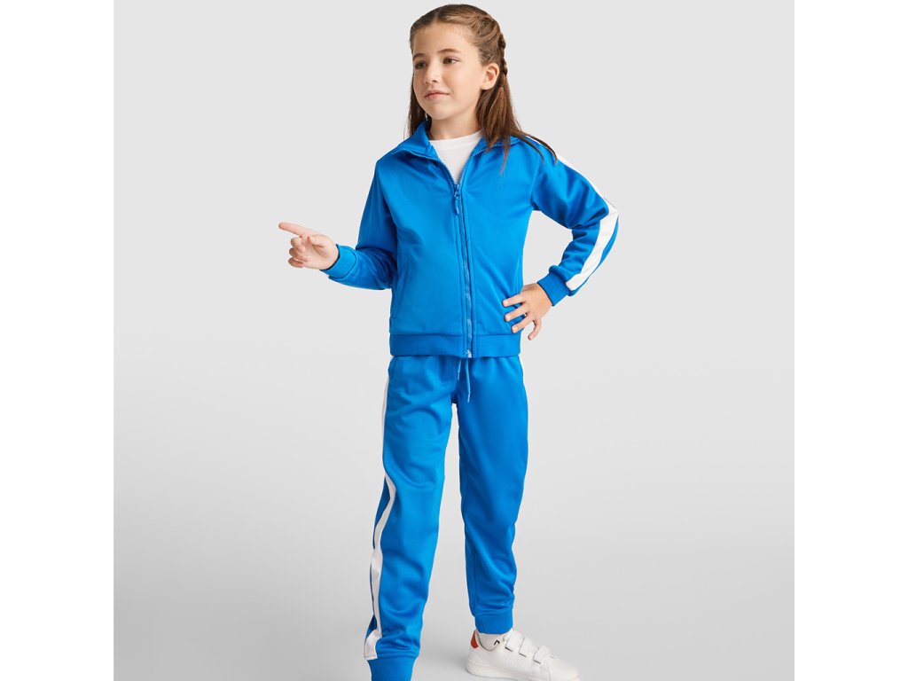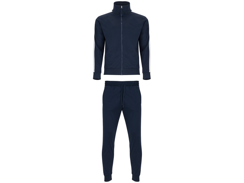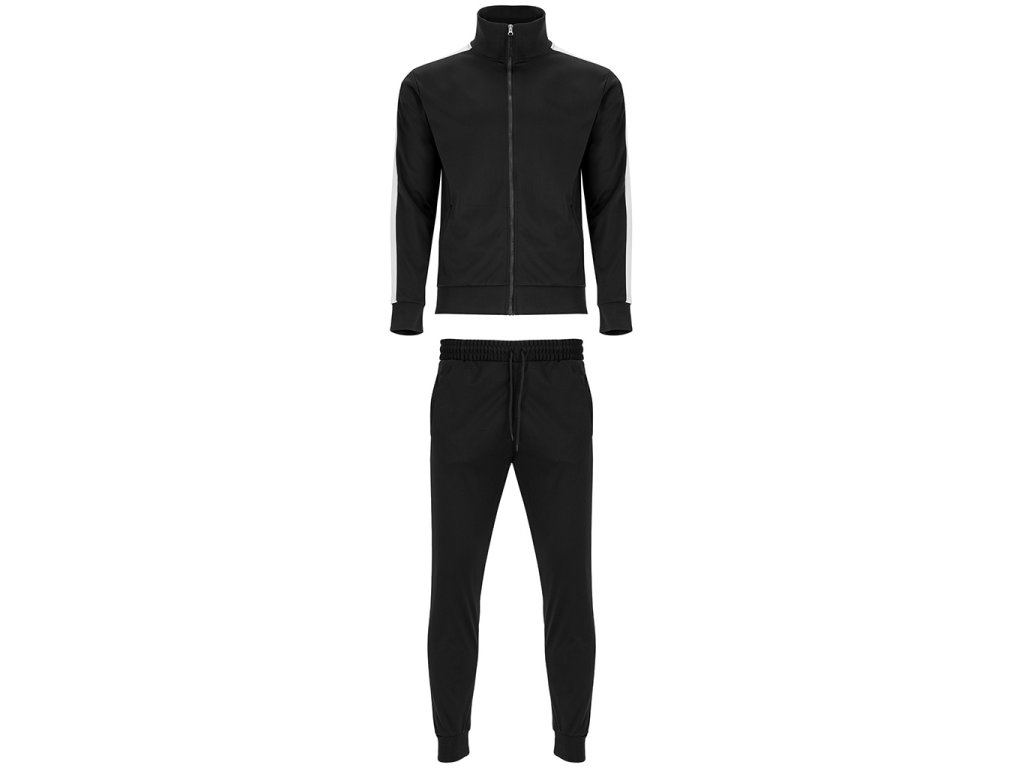Tepláková souprava - obsahuje mikinu a kalhoty. Souprava obsahuje 1. vysoký límec, 2. Límec, manžety a spodní lem s žebrováním 1x1, 3. Celozip v ladící kombinaci s poutkem, 4. Postranní kapsy mikiny se zapínáním na zip, 5. Kontrastní postranní pruh na mikině i kalhotech, 6. Kalhoty jsou s elastickým pasem a nastavitelnou šňůrkou, 7. Dvě postranní kapsy, 8. Zadní kapsa na zip, 9. Spodní lem s elastickými žebrovanými manžetami 1x1.