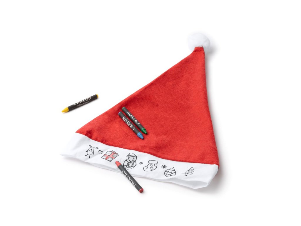 Dětská vánoční čepice k vybarvování. Vánoční vzory na přední straně bílého pásku. Obsahuje 4 barevné pastelky.