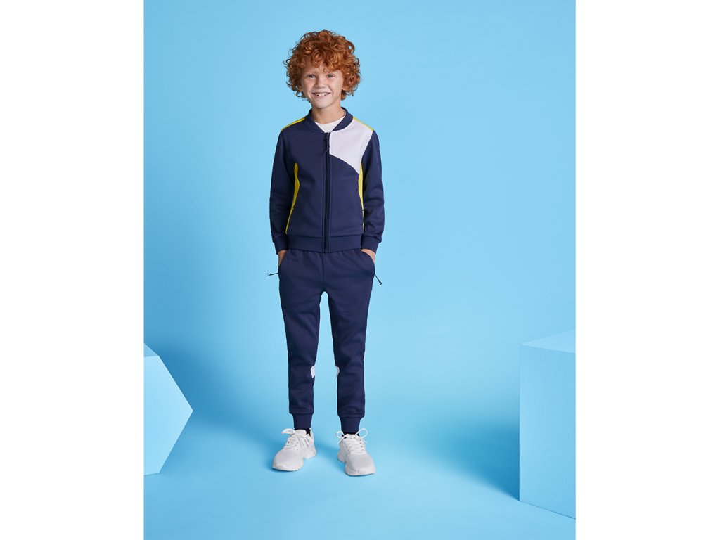 Sportovní kalhoty s elastickým pasem a nastavitelnou šňůrkou. Boční kapsy se zapínáním na zip. Kontrastní pruhy v bílé barvě. Lem s 1x1 žebrovanou manžetou. Lze kombinovat s bundou LEROS.