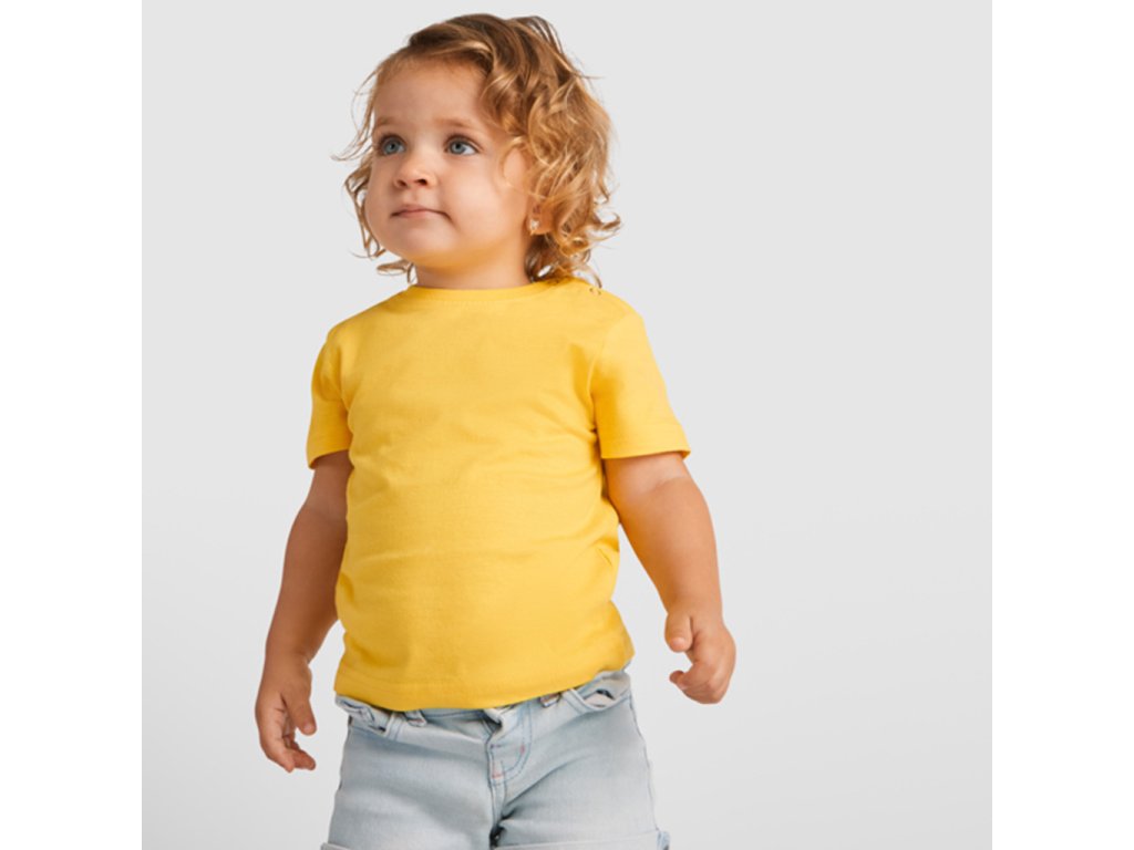 Bavlněné dětské tričko s kulatým průkrčníkem a bočními švy. Velikosti 6, 12 a 18 měsíců se zapínáním na rameni.