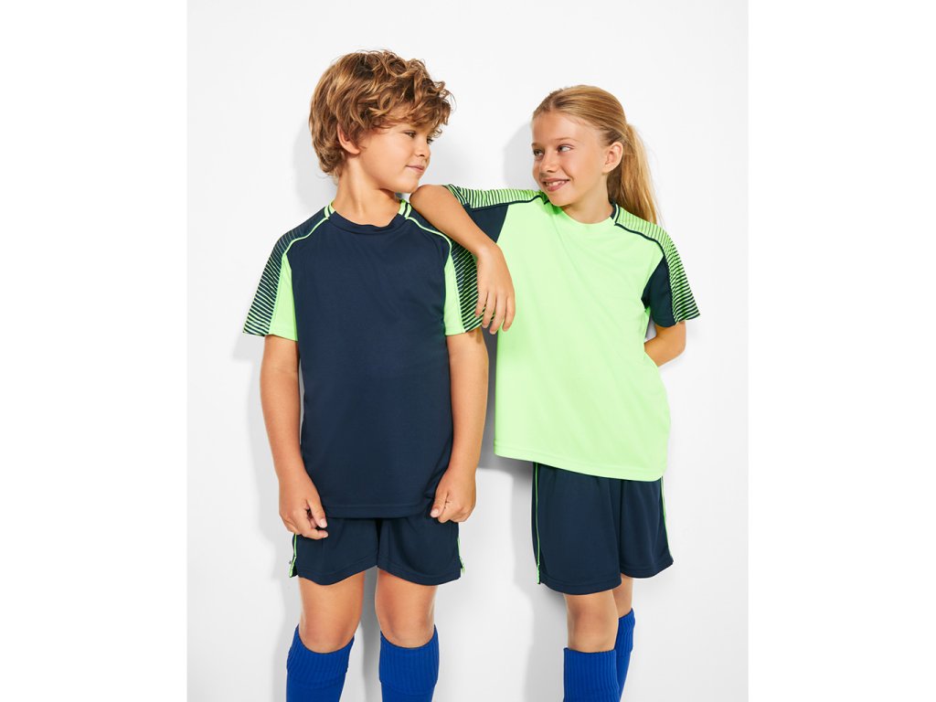 Sportovní souprava unisex. Obsahuje 2 trička a 1 kraťasy. Tričko s raglánovým rukávem a potiskem. Kulatý výstřih s úpletem na zadní straně. Barva druhého trička je zkombinovaná opačným způsobem. Kraťasy s elastickým pasem a vnitřní šňůrkou tón v tónu a s bezpečnostním prošitím. Kontrastní postranní pruh a postranní rozparek na spodním lemu nohavice kraťas.