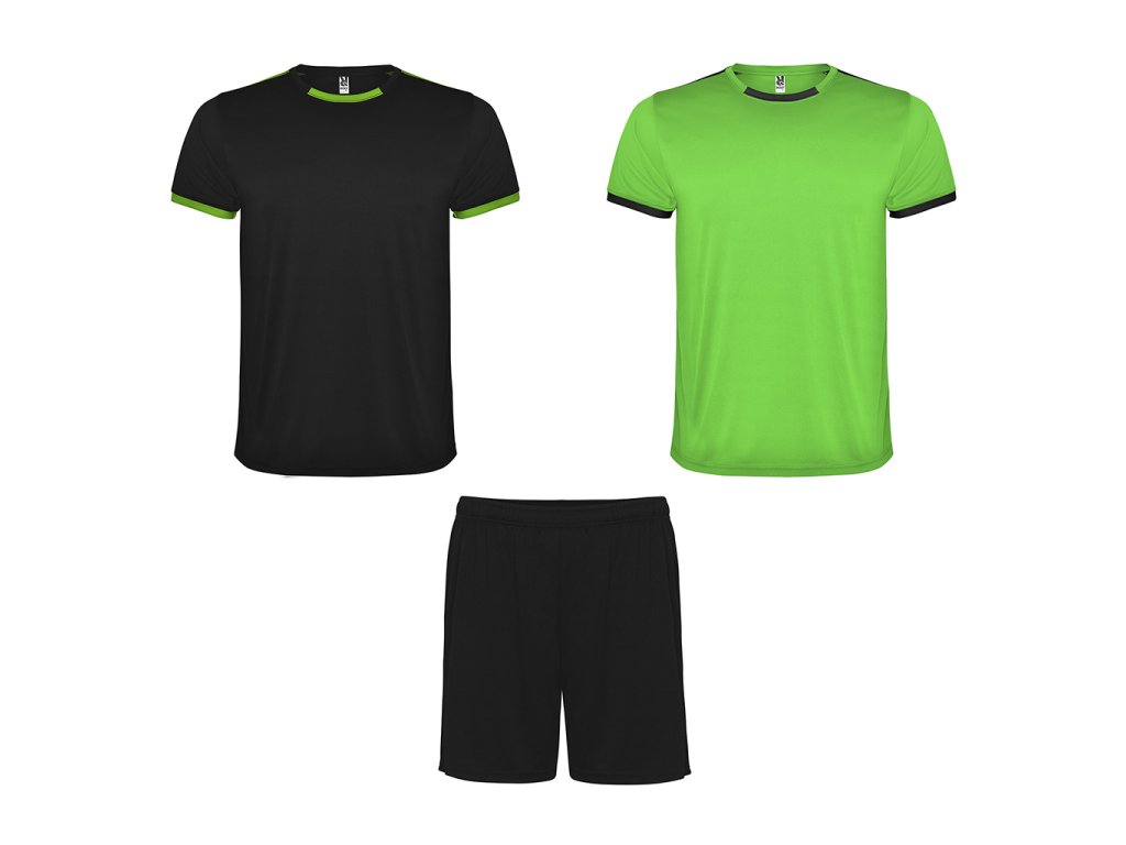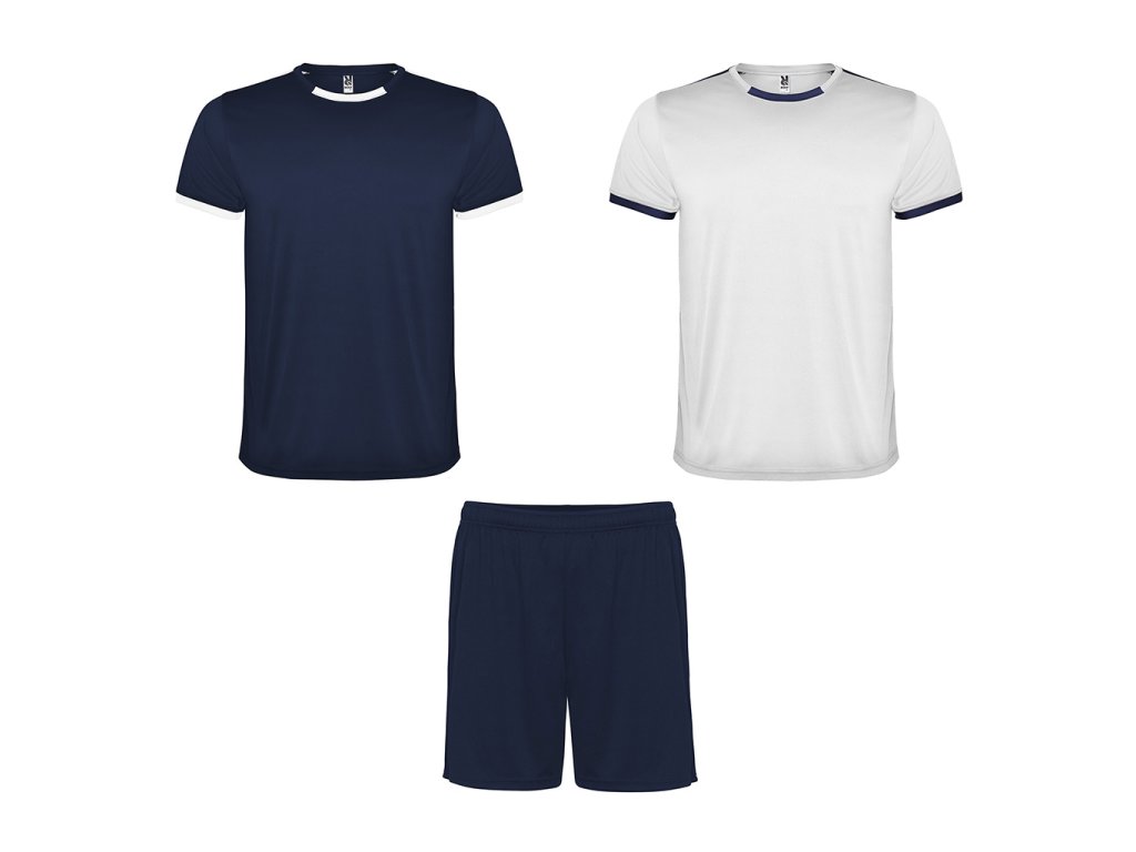 Sportovní unisex set, který obsahuje 2 trika a šortky. Krátké rukávy s kontrastním lemem. Kontrastní barva druhého trika. Dvoubarevný kulatý výstřih s pasovkou za krkem. Kalhoty s elastickou šňůrkou.