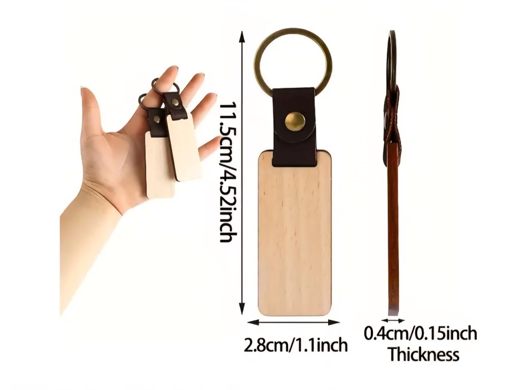 Elegantní klíčenka vyrobená z hladkého dřeva s páskem z umělé kůže a kovovým kroužkem. Ideální pro vytvoření osobního dárku nebo reklamního předmětu pomocí laserového gravírování.