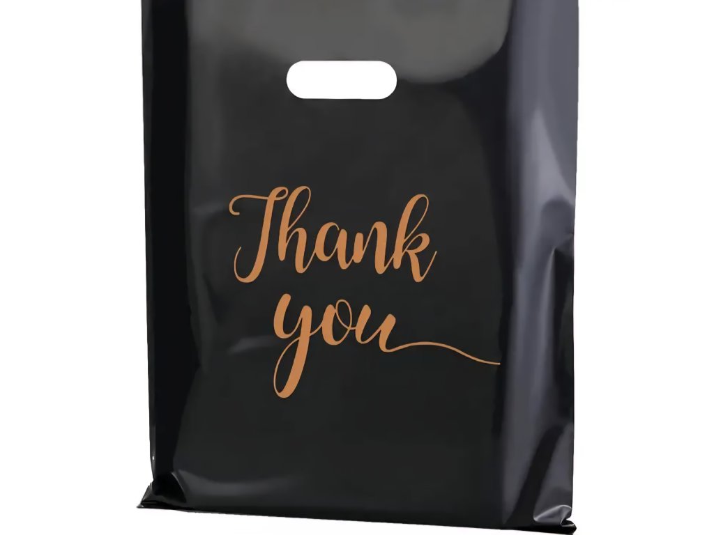 Elegantní a moderní design: Lesklá černá taška s prémiovým nápisem "Thank you" v barvě růžového zlata / mědi, který působí luxusně a vkusně.