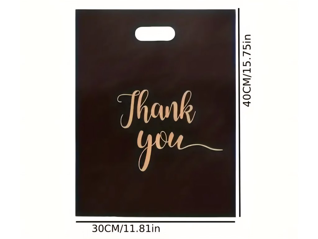 Tato černá taška je vyrobena z pevného a kvalitního plastu, který je dostatečně odolný pro bezpečné odnesení oblečení, doplňků, kosmetiky nebo dárkových předmětů. Dominantou je vkusný nápis "Thank you" v moderním kaligrafickém stylu a luxusní měděné barvě (rose gold), která na černém podkladu krásně vyniká. Pohodlný průsekový úchyt zajišťuje komfortní nošení.