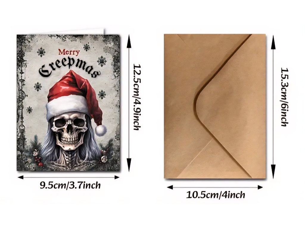 Každé přání je tištěno na kvalitním pevném papíře a vyniká detailním, umělecky zpracovaným motivem, který originálně kombinuje vánoční symboly s gotickou a hororovou estetikou. Uvnitř je přání prázdné, aby se do něj vešel váš jedinečný, rukou psaný vzkaz. Ke každému přání je přibalena i stylová obálka z přírodního hnědého papíru.