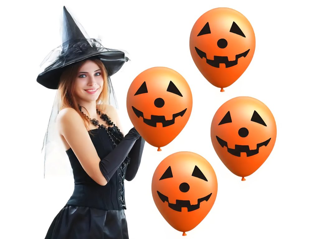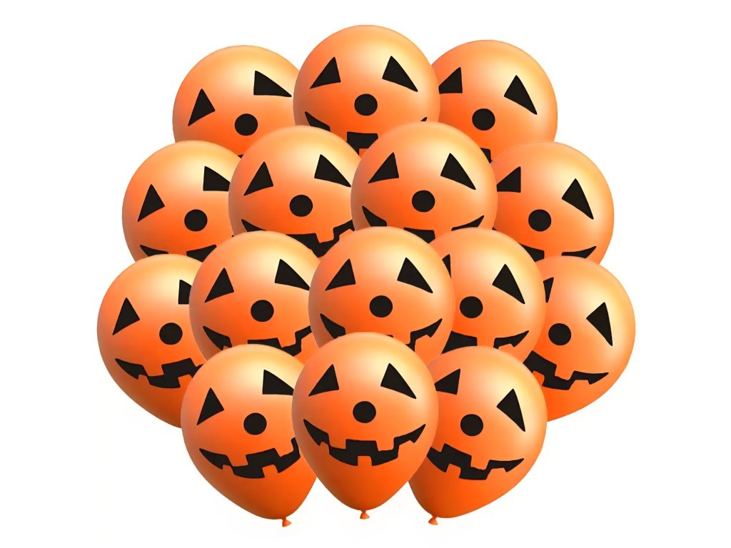 Ikonický halloweenský design: Zářivě oranžové balónky s výrazným černým potiskem obličeje halloweenské dýně, který každý okamžitě pozná.