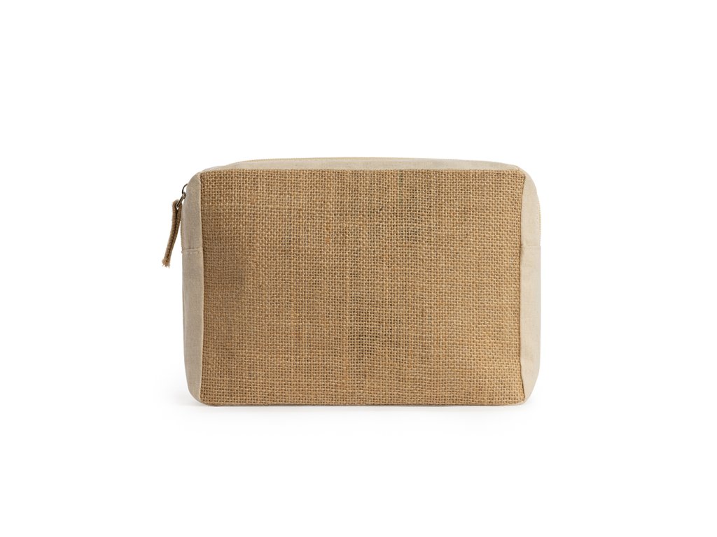 Toaletní taška z bavlny a laminované juty. Zip s odpovídajícím jutovým taháčkem.
