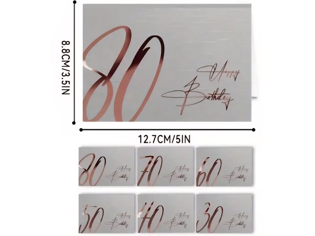 Toto přání zaujme na první pohled svým čistým, minimalistickým designem. Na jemném světle šedém podkladu dominuje výrazné číslo jubilea a kaligrafický nápis "Happy Birthday". Obojí je provedeno v nádherné metalické fólii v barvě růžového zlata, která se na světle krásně leskne a dodává přání prémiový vzhled.