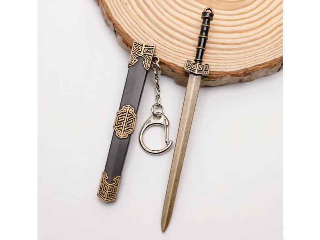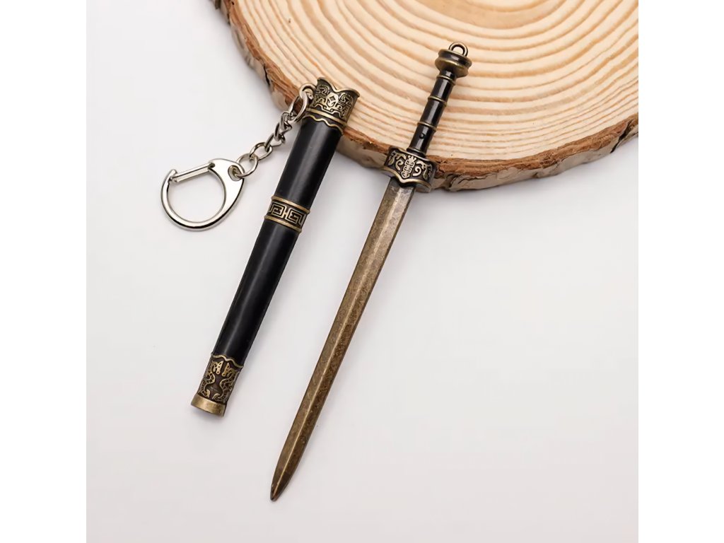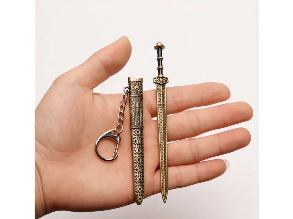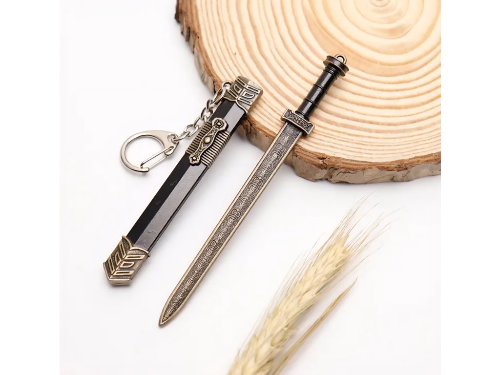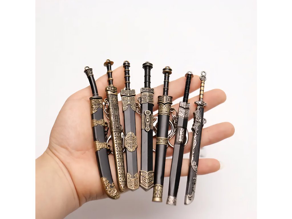 Elegantní kolekce miniaturních mečů s asijskými/čínskými historickými motivy. Tyto meče slouží jako přívěsky na klíče a obsahují detailní pochvu (pouzdro), ze které lze meč vytáhnout. Jsou vyrobeny z kovu a zdobeny ornamenty, které napodobují styl katany, dao nebo jian mečů, často s patinovanou starožitnou úpravou.