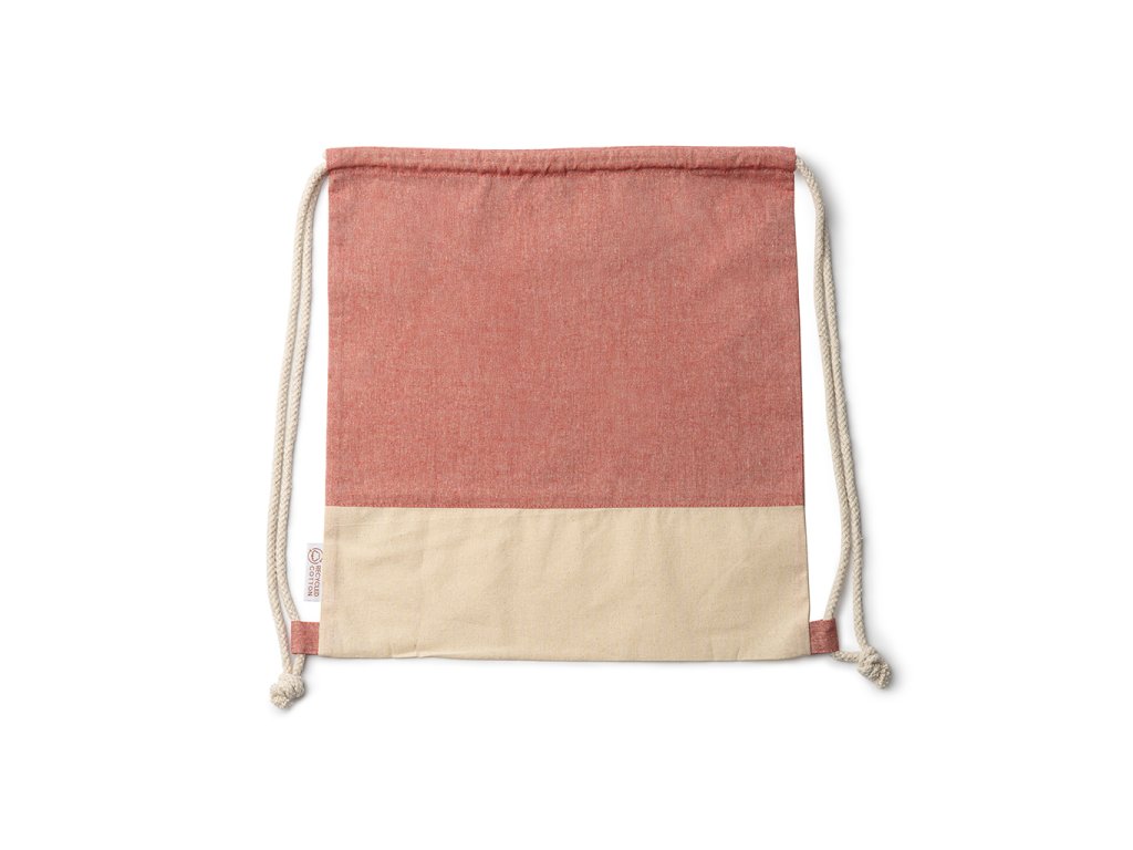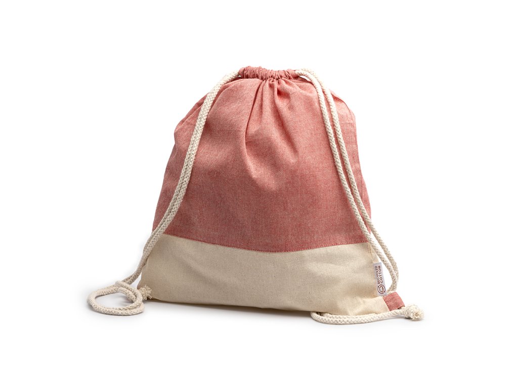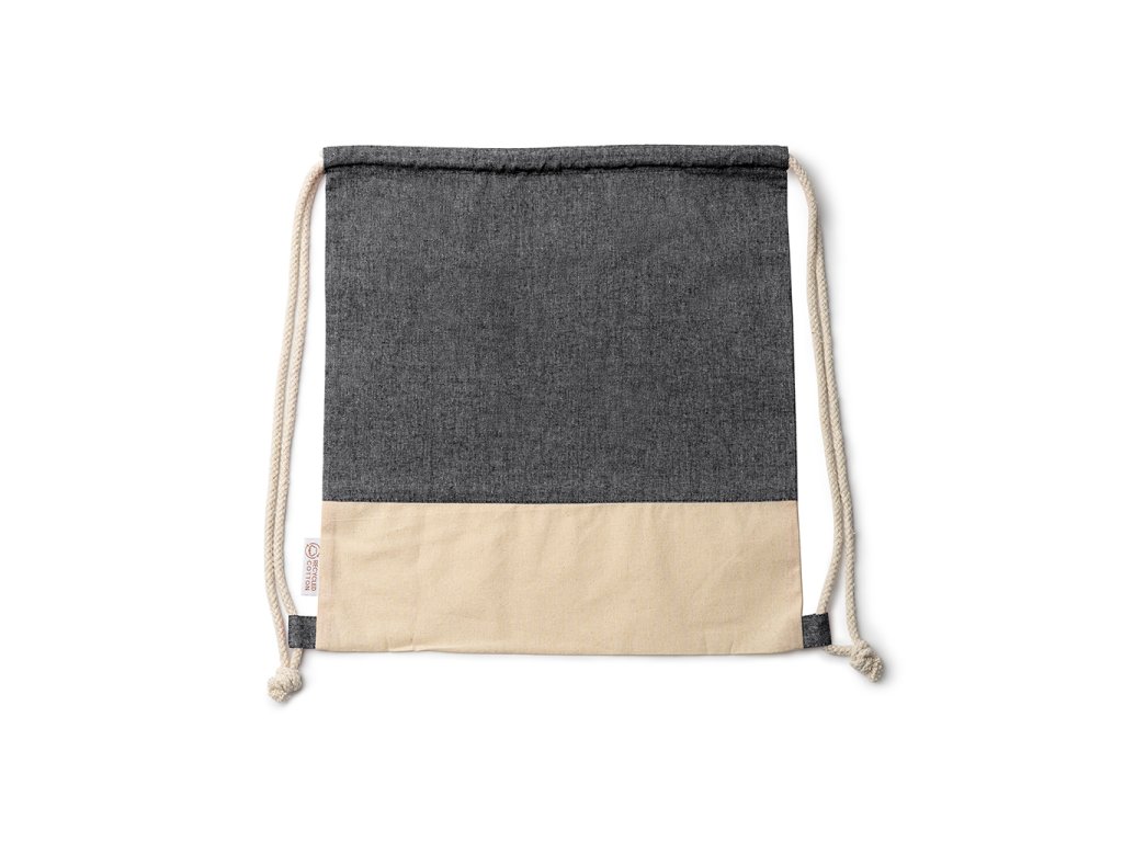 Batůžek se stahovacími šňůrkami z recyklované bavlny v designu s vřesovou úpravou a z přírodní bavlny o gramáži 120 g/m². Šňůrky v přírodní barvě.