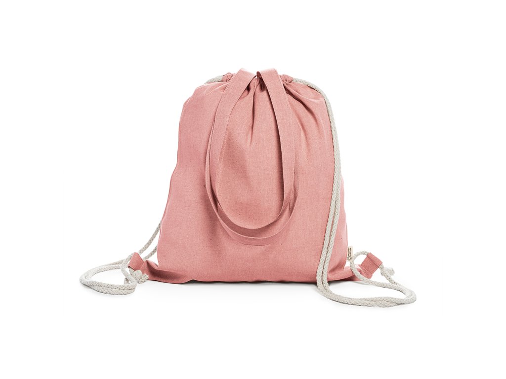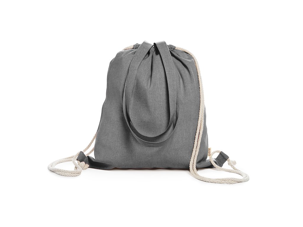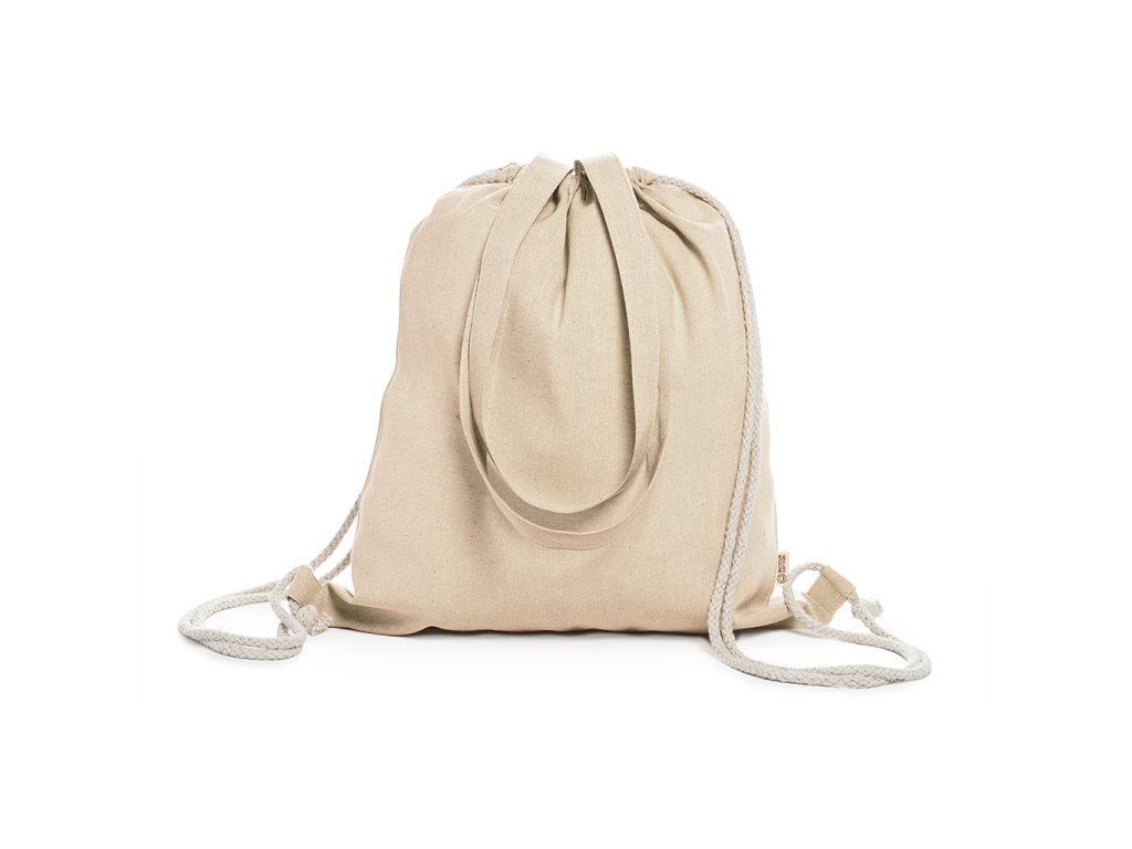 Sportovní batůžek se stahovacími šňůrkami ze 100% recyklované bavlny v kropenaté úpravě, se 70 cm dlouhými odpovídajícími uchy a šňůrkami v přírodní barvě. Gramáž 140 g/m².