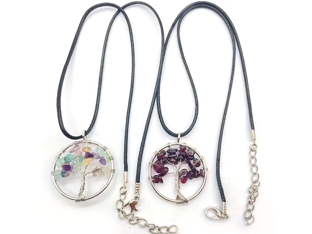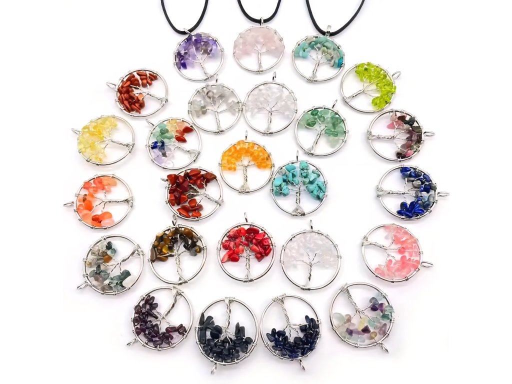 Přívěsek je pečlivě vyroben z postříbřeného drátku, který je spleten do tvaru stromu v elegantním kruhovém rámu. Korunu stromu tvoří úlomky pravých přírodních kamenů a minerálů v mnoha různých barvách a druzích – v nabídce se objevuje například ametyst, růženín, avanturín, tygří oko, granát, achát, křišťál a mnoho dalších.