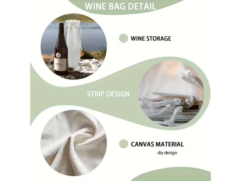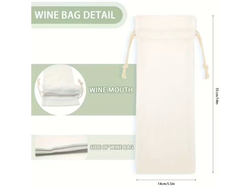 Popis: Hledáte originální způsob, jak darovat láhev vína? Naše plátěná taška je elegantní, ekologickou a praktickou volbou. Je vyrobena z odolného canvas materiálu, který láhev spolehlivě ochrání. Díky jednoduchému designu se stahovací šňůrkou se snadno používá a vypadá skvěle.