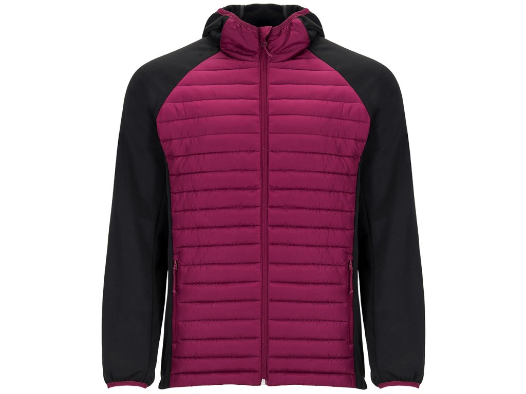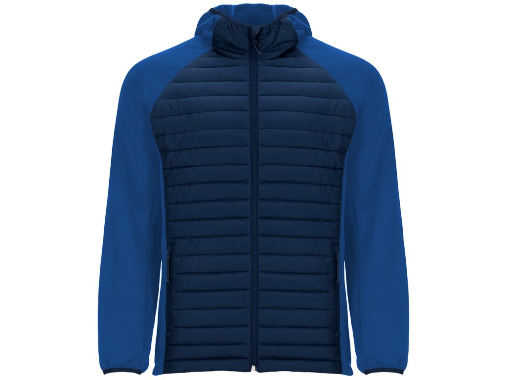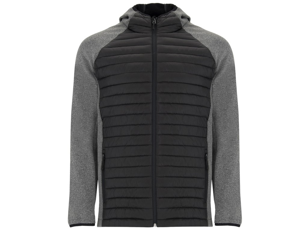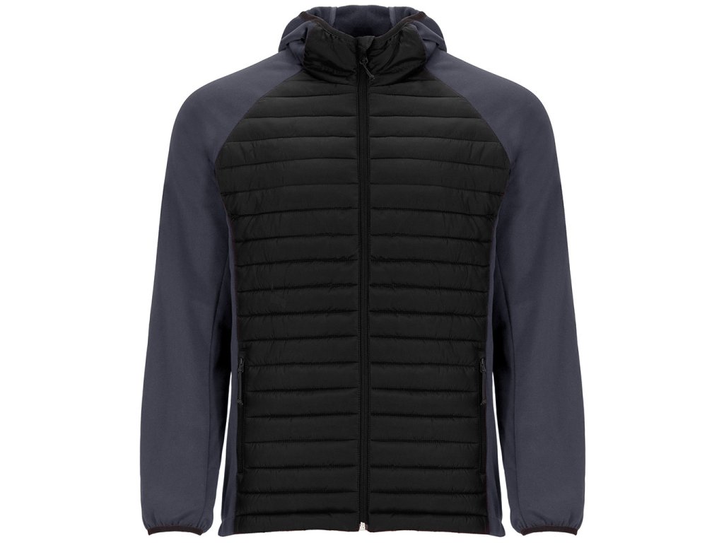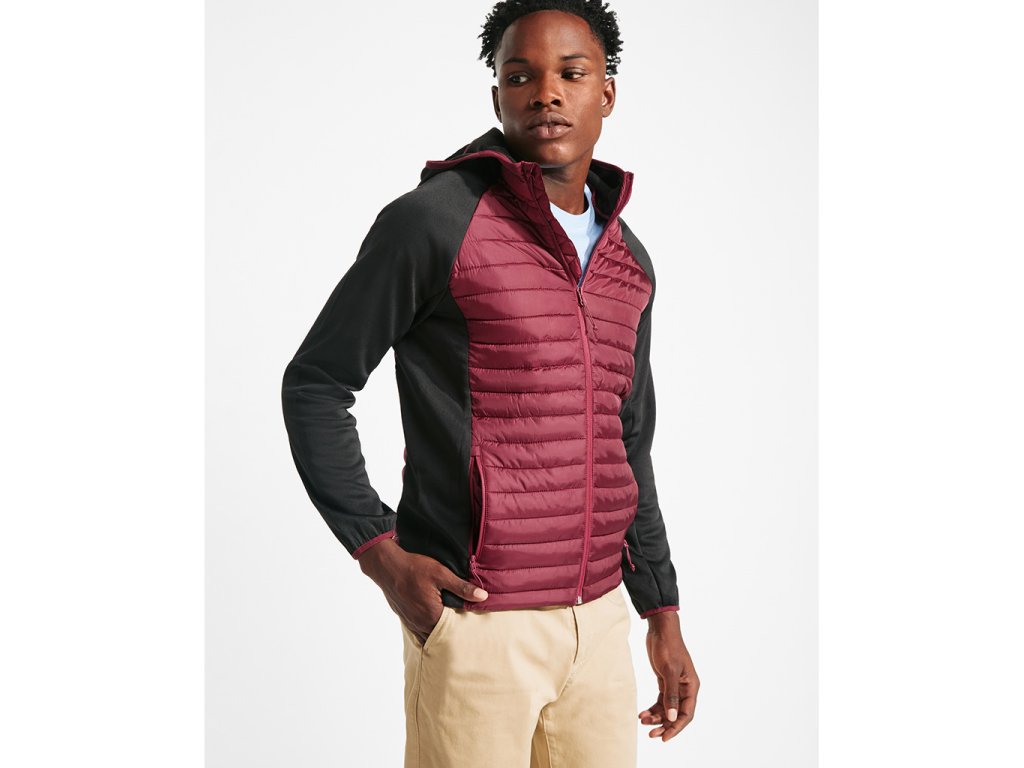 Pánská bunda v kombinaci dvou látek. Napevno přišitá padnoucí kapuce. Rukáv raglánového stylu. Na rukávech, postranních panelech a kapuci látka stylu softshell. Přední a zadní strana z jemné prošívané látky. Obrácený zip v ladící kombinaci s ochranou pro bradu a poutkem. Dvě přední kapsy se zipy. Elastická obruba v ladící kombinaci u krku, na manžetách a spodním lemu. Odnímatelný štítek. Bunda je odolná proti větru.