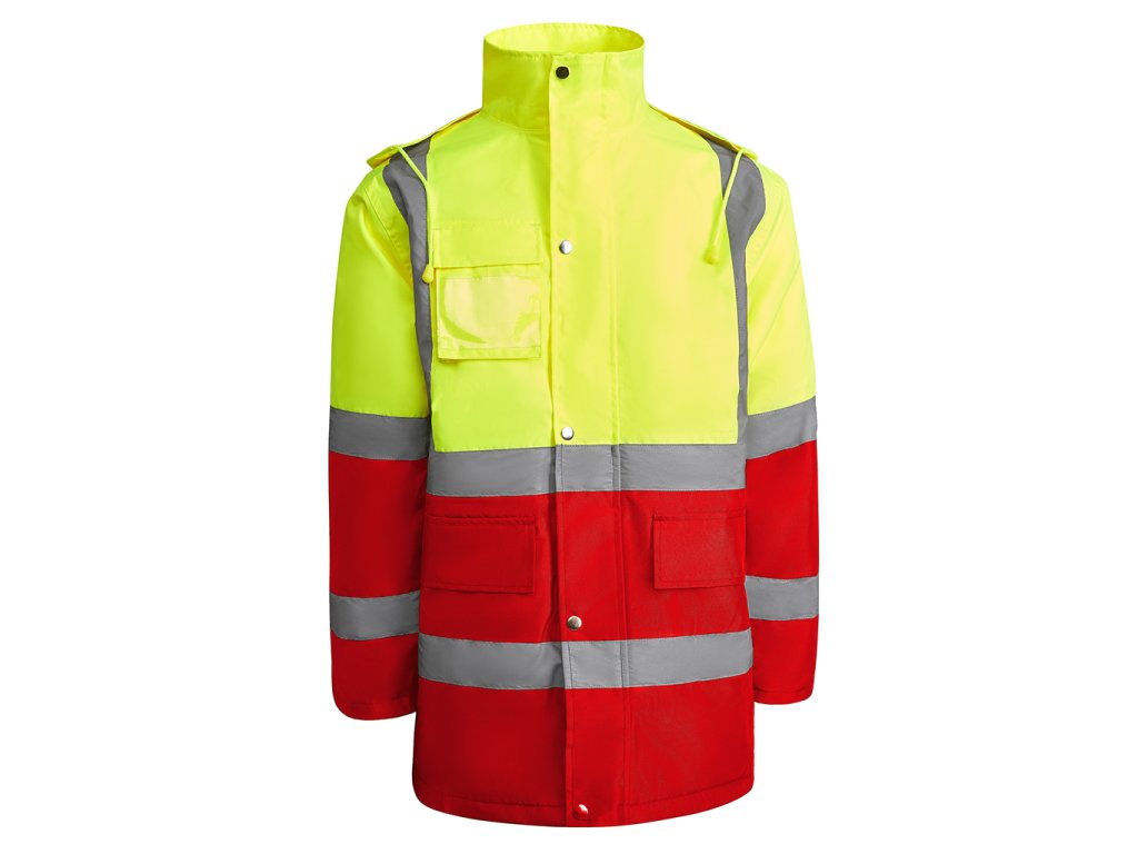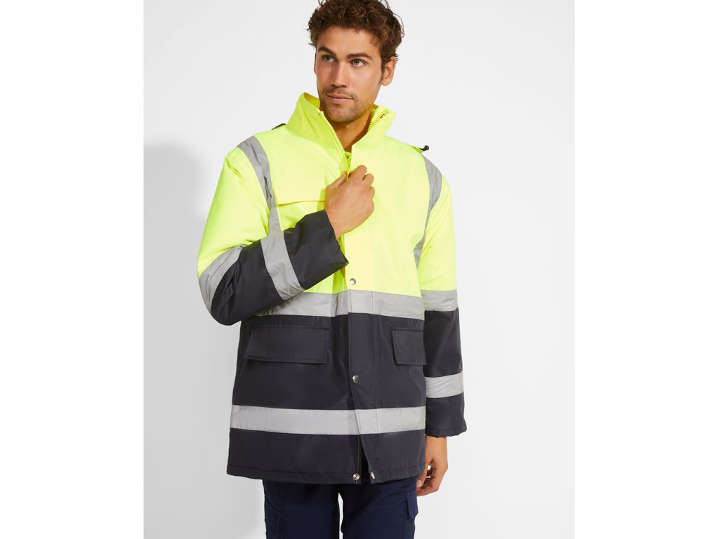 Kombinována a polstrovaná parka s vysokou viditelností. Voděodolná tkanina s tepelně utěsněnými švy. Dva vodorovné pruhy s vysokou viditelností na hrudi a rukávech a svisle na ramenou. Skládací kapuce s nastavitelnou stahovací šňůrkou. Náprsní kapsa s klopou, suchým zipem a identifikačním štítkem. Dvě přední kapsy s chlopní. Vnitřní kapsa se zapínáním na zip. Ukryté žebrované manžety 1x1. Přední zapínání na kovové knoflíky a dvojitý přední zip. Vnitřní přístup pro sítotisk. Podšívka: 100% polyester, výplň: 100% polyester. Certifikace CE podle norem: EN ISO 13688:2013/A1:2021 a EN ISO 20471:2013/A1:2017. UNE-EN 343:2019. Třída 3:3. UNE-EN 14058:2017. Třída 2. Třída II: 55221 - 55223 - 52221 - 23221. Třída III: 221.