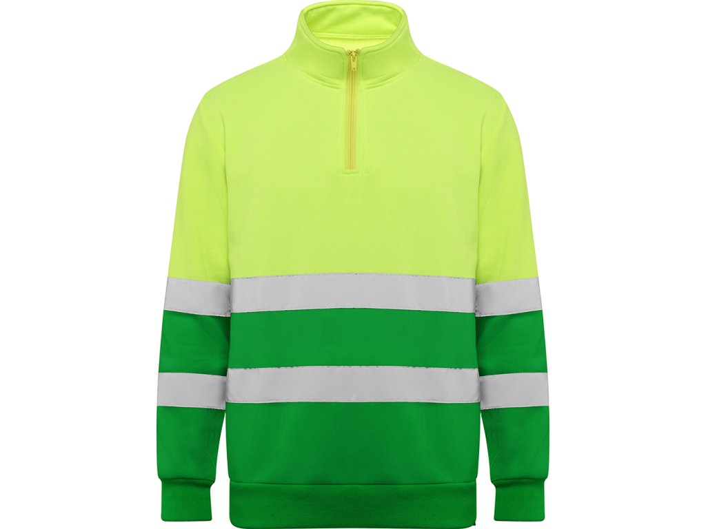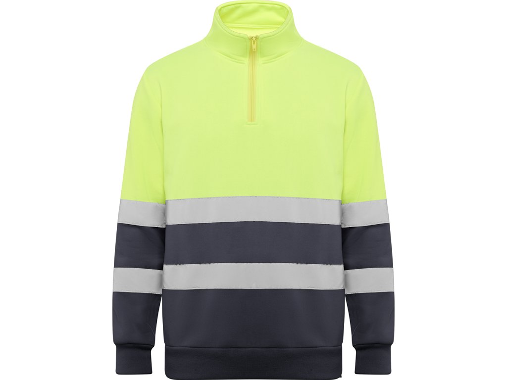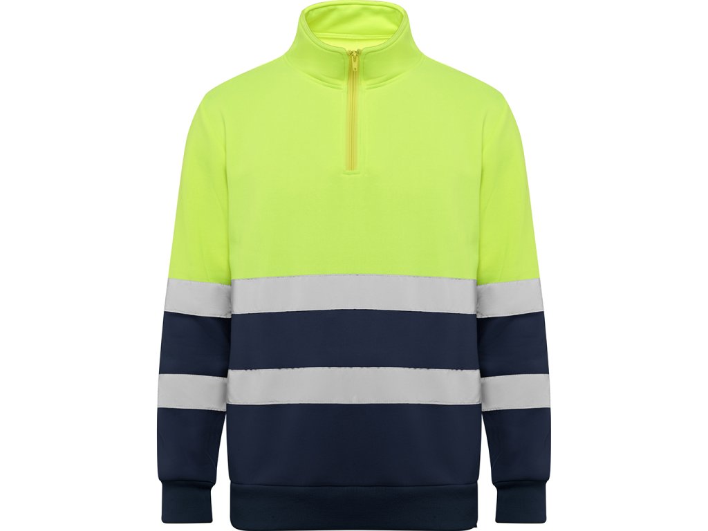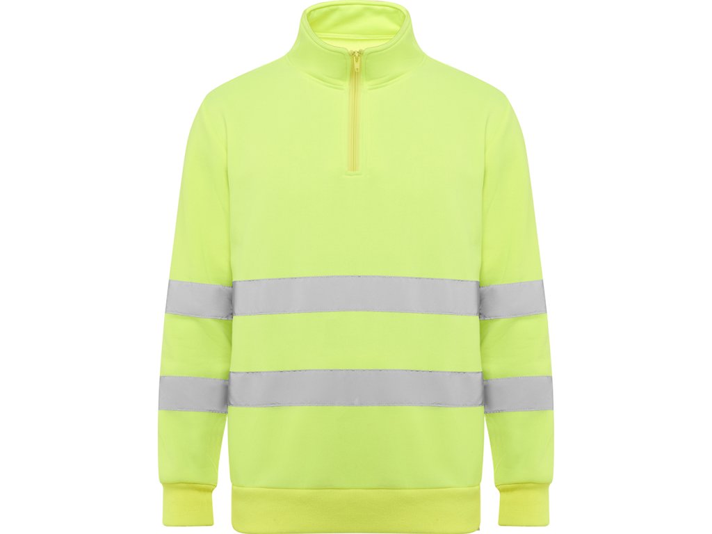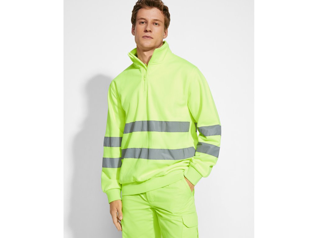 Pánská reflexní mikina s polovičním zipem, vysokým límcem, chráničem brady a zesíleným prošitím na vnitřním límci. Mikina má vodorovné reflexní pruhy na hrudí a na rukávech, 1x1 žebrovanou látku na manžetách a lemu. Certifikace CE podle norem: UNE-EN ISO 13688:2013/A1:2021 a UNE-EN ISO 20471/2013/A1:2017. Třída II.