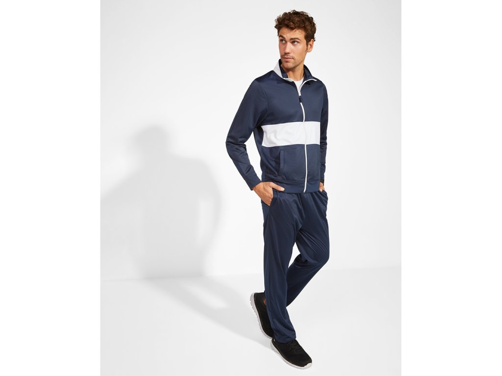 Sportovní souprava, která obsahuje bundu a kalhoty. Vysoký límec. Přední kapsy s lemem. Manžety a pás v žebrovaném lemu 1x1. Celopropínací zip. Kalhoty s pružným pasem se dvěma bočními kapsami s kontrastním lemem. Velmi příjemná vnitřní strana.
