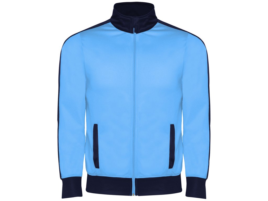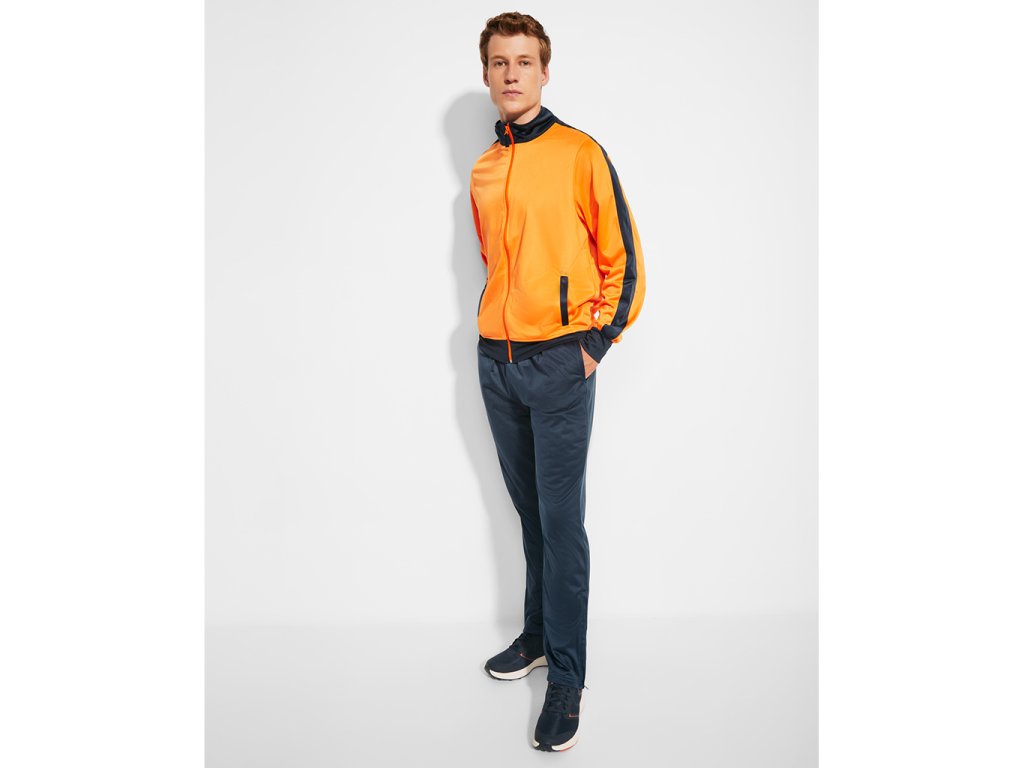 Dětská sportovní souprava, skládající se ze 2 části - tepláky a mikina. Vysoký límec se zapínáním na zip s krytkou na bradu. Přední kapsy s kontrastním lemem. Kontrastní manžety a žebrovaný lem 1x1. Celopropínací zip. Kalhoty s pružným pasem s dvěma bočními kapsami s kontrastním lemem. Velmi příjemná vnitřní strana.