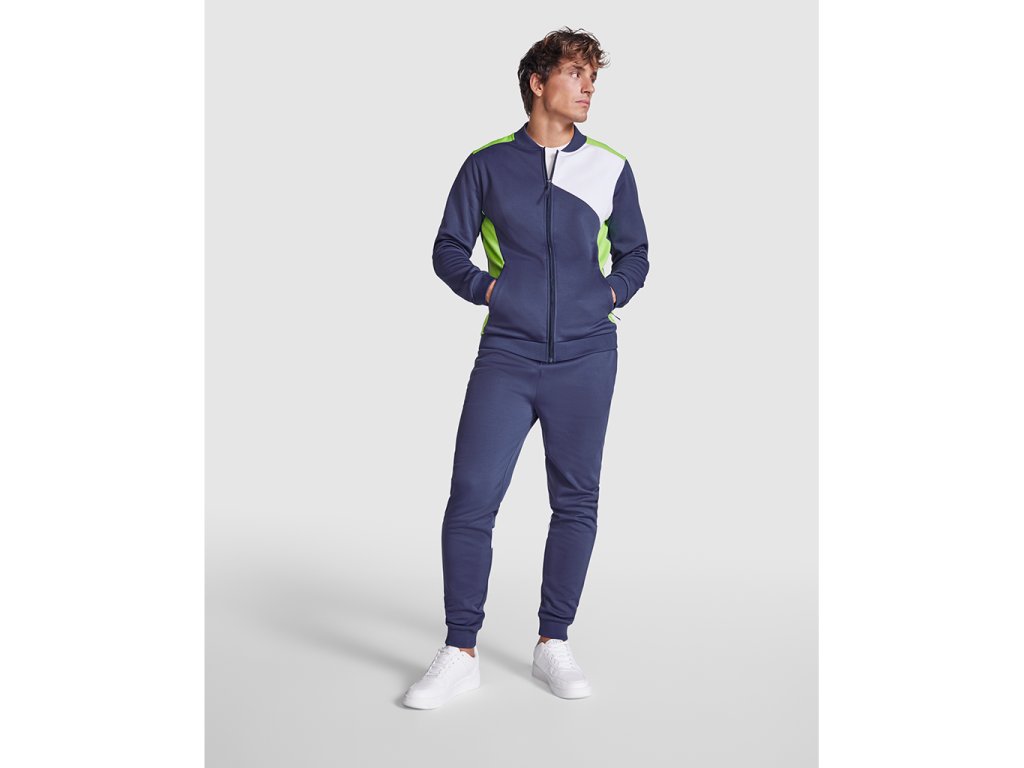 Sportovní bunda s předním zapínáním na zip. Boční kapsy se zapínáním na zip. Límec, manžety a spodní lem s 1x1 žebrováním. Asymetrický hlavní prvek na levé straně hrudníku, speciálně navržený pro vyšívání. Lze kombinovat s kalhotami Rodas.