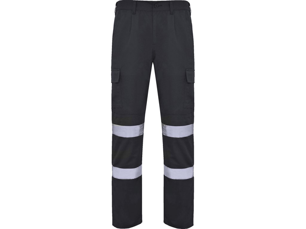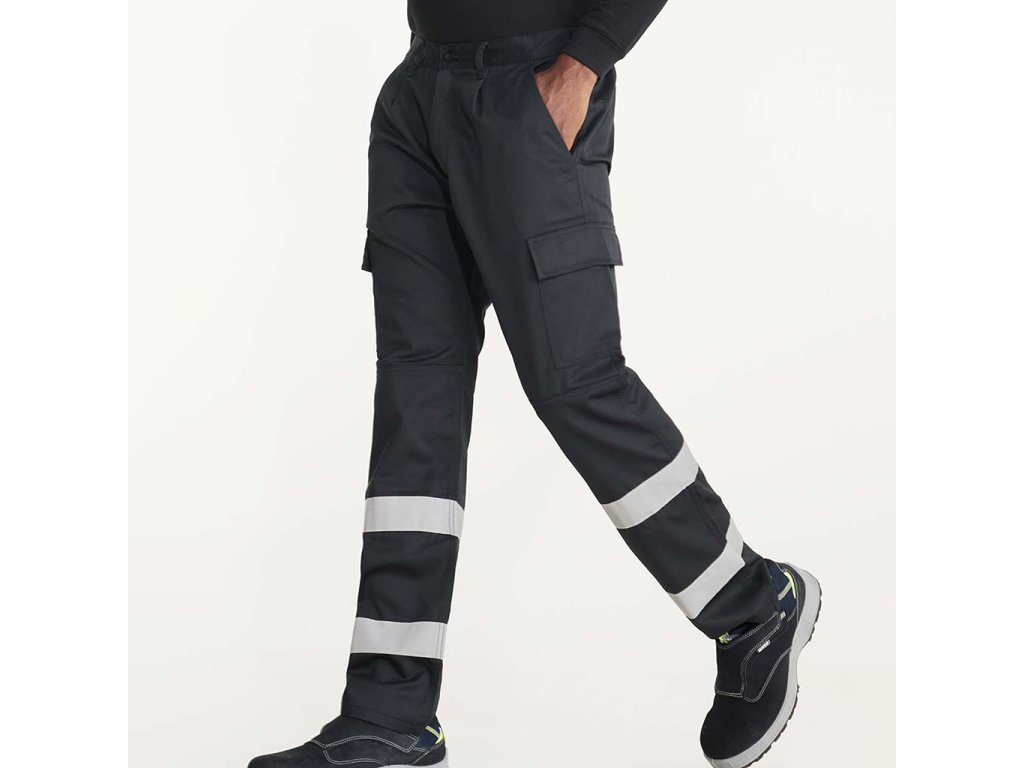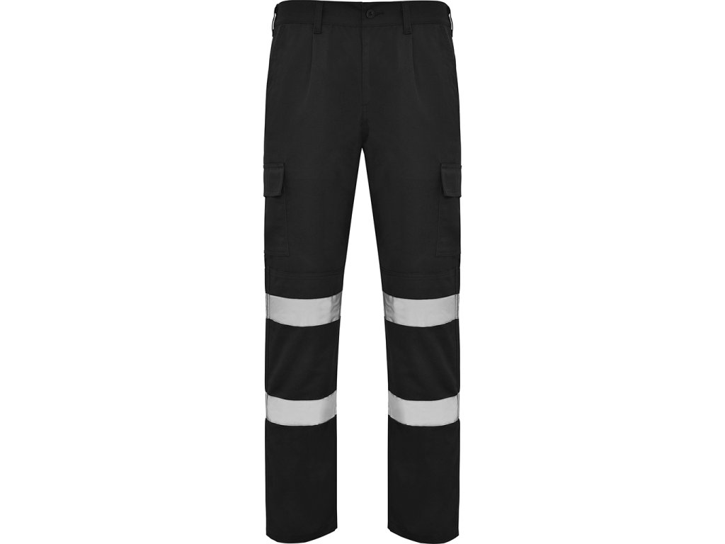 Pracovní kalhoty s vysokou viditelností z pevného materiálu. Elastický pás v zadní části. Dvě přední kapsy, funkční zadní kapsa a dvě boční kapsy s patkou a suchým zipem. Zesílený sed, dvojitý materiál na kolenou. Dva vodorovné reflexní pásy. Certifikace CE podle normy UNE-EN ISO 13688:2013/A1:2021 a EN 17353:2020. Třída B2.