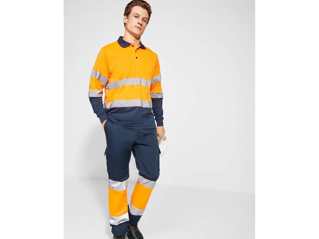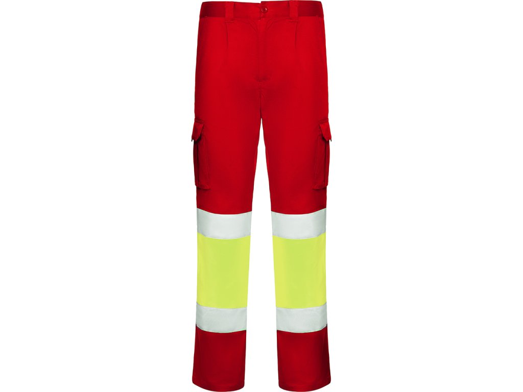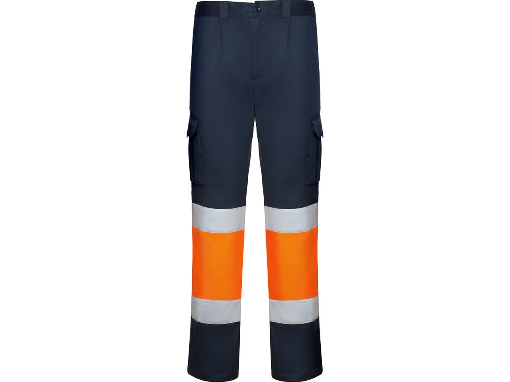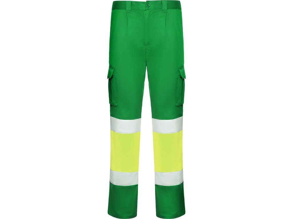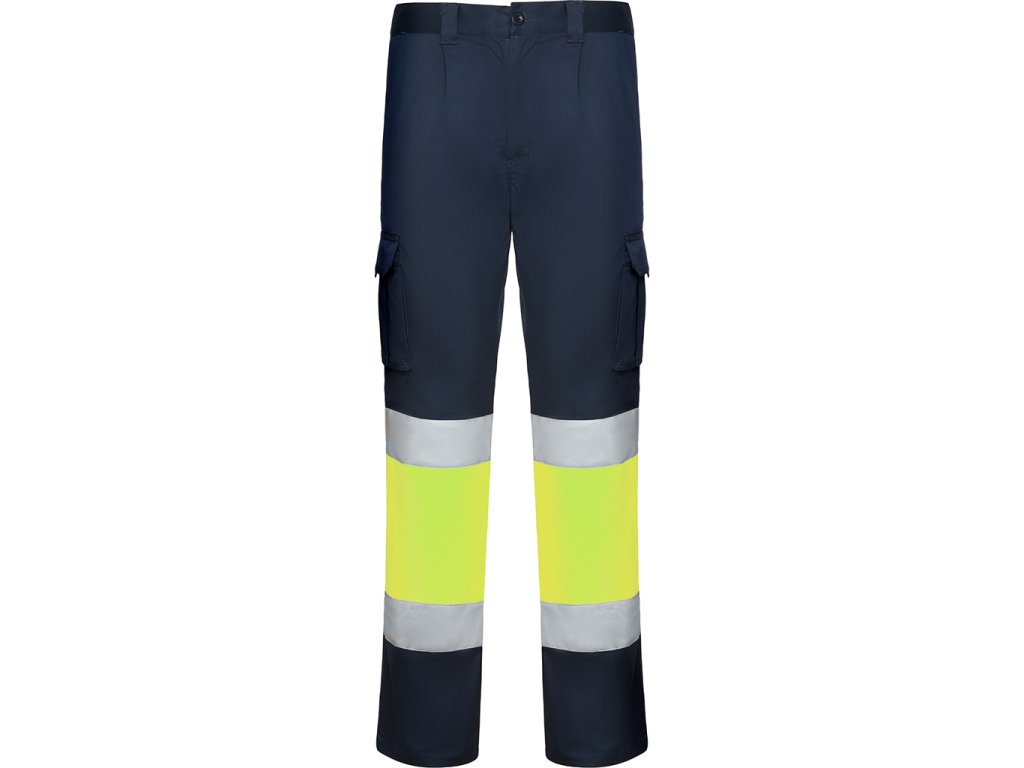 Pracovní dlouhé kalhoty s reflexními pruhy. Pohodlná a pružná tkanina. Nastavitelný elastický pas v zadní části. Kalhoty, které mají dvě přední kapsy, zadní a boční kapsy s klopou a zapínáním na suchý zip. Kombinace dvou barev s reflexními pruhy. Certifikace CE podle norem: EN ISO 13688:2013/A1:2021 a EN ISO 20471:2013/A1:2017. Třída I.