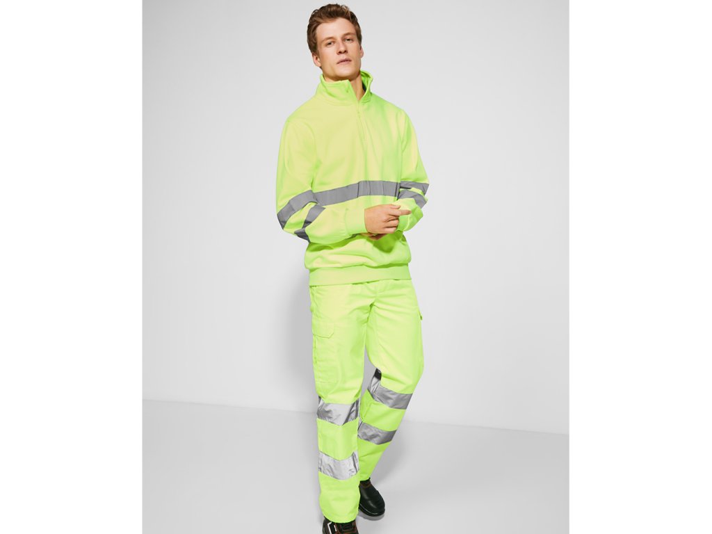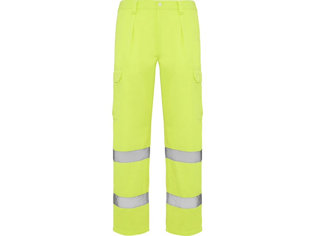 Pracovní kalhoty s vysokou viditelností. Nastavitelný elastický pas v zadní části. Dvě přední kapsy. Funkční zadní kapsa a dvě boční kapsy s patkou a suchým zipem. Dva reflexní vodorovné pruhy. Certifikace CE podle norem: EN ISO 13688:2013/A1:2021 a UNE-EN ISO 20471:2013/A1:2017. Třída II.