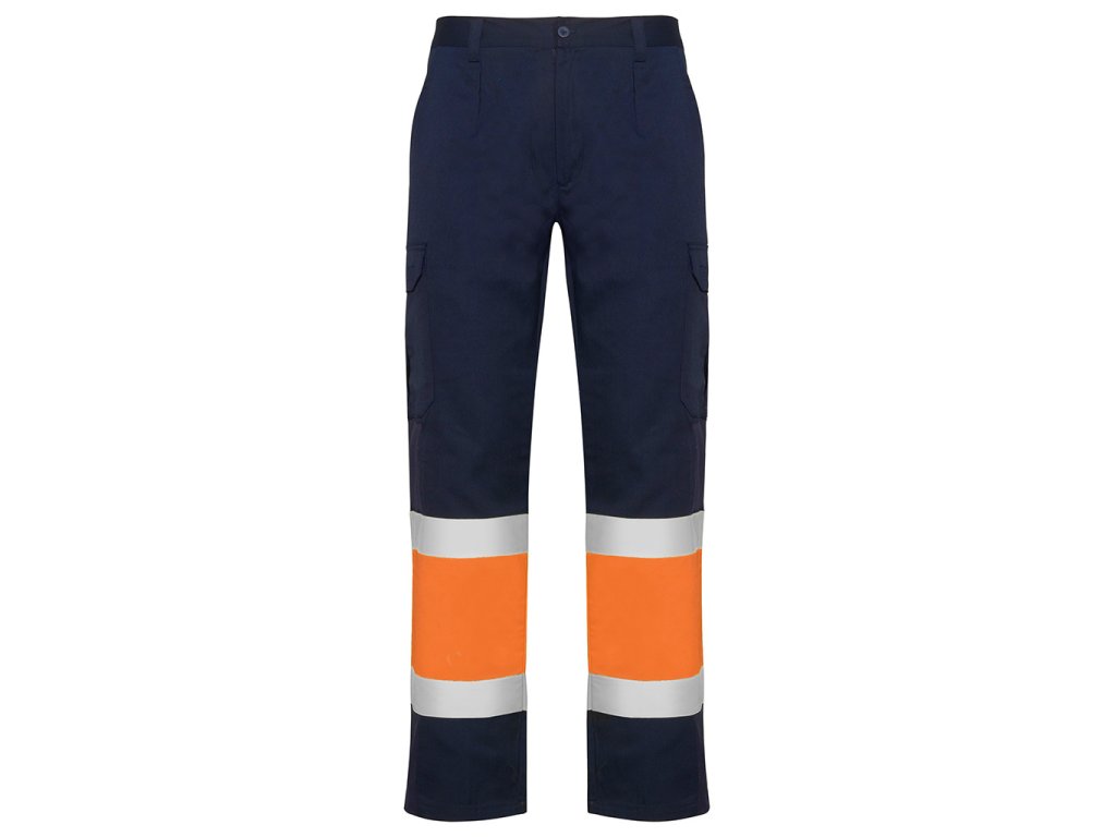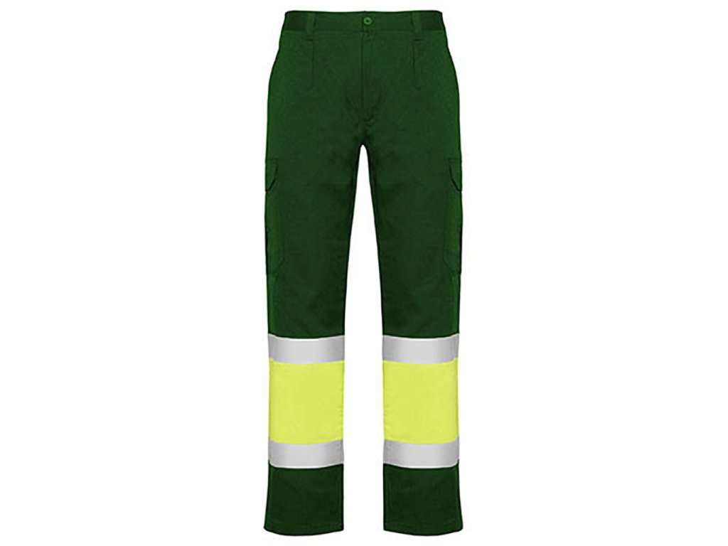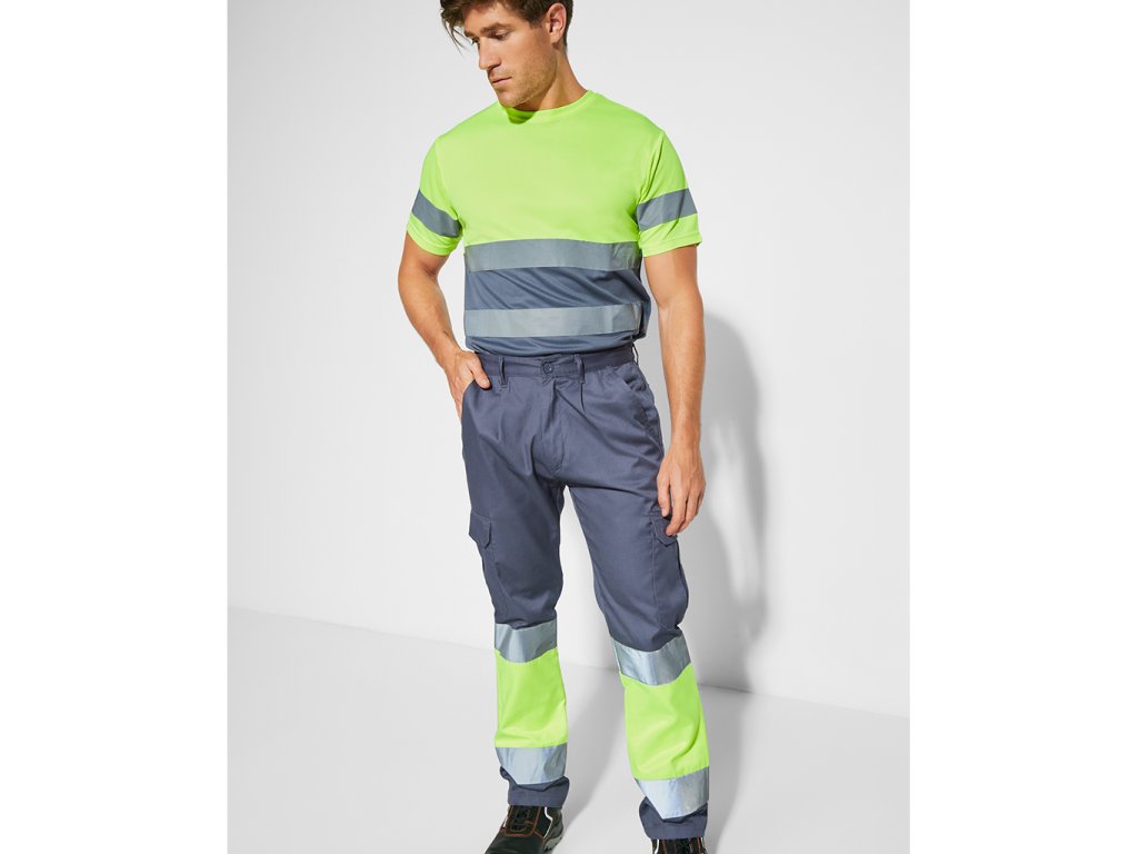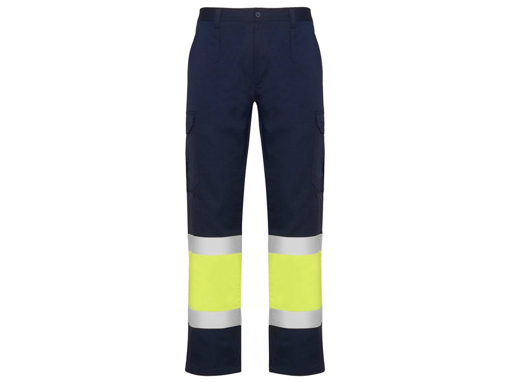 Multifunkční reflexní kalhoty s vysokou viditelností. Elastický pás vzadu. Dvě zadní kapsy s patkou a suchým zipem. Dvě přední kapsy a dvě boční kapsy s patkou a suchým zipem. Kombinace dvou barev, s reflexními pruhy. Vnitřní strana z prodyšné síťoviny. Certifikace CE podle norem: EN ISO 13688:2013/A1:2021 a EN ISO 20471:2013/A1:2017. Třída I.