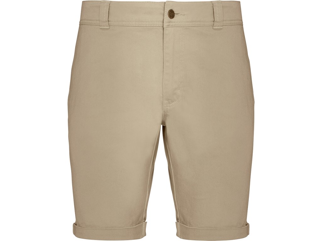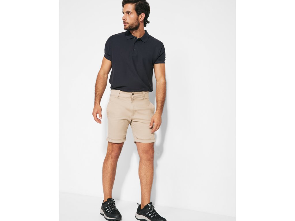 Bermudy ze zahnutým spodním lemem a zpevněním prošíváním. Zadní a boční kapsy v jedné barvě. Odolný materiál, pohodlný střih, vhodné pro volný čas i práci.