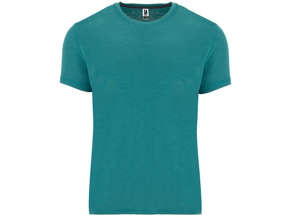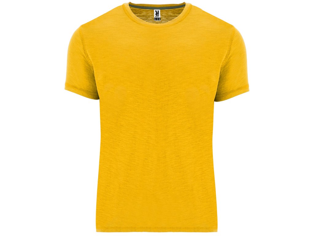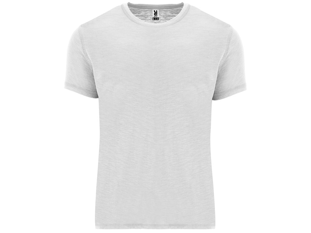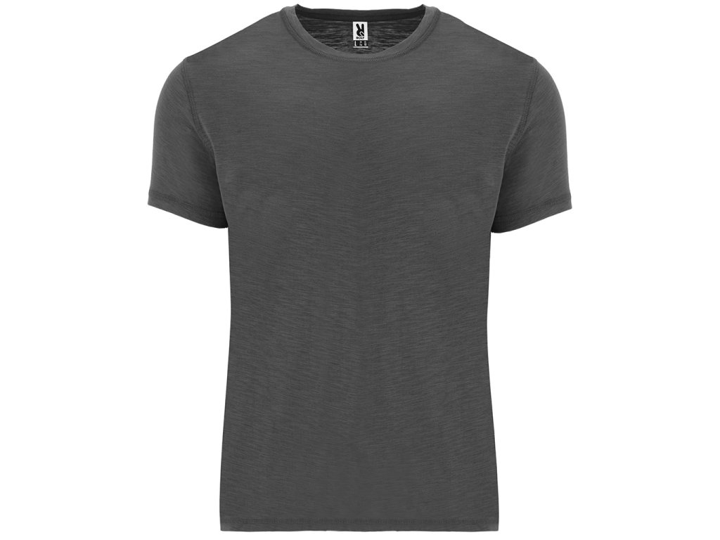Tričko s krátkým rukávem, melange vzor. Kulatý výstřih ze stejné látky. Boční švy. Spodní lem s postranními rozparky a střih zadního dílu je trochu delší než přední. Odnímatelný štítek.