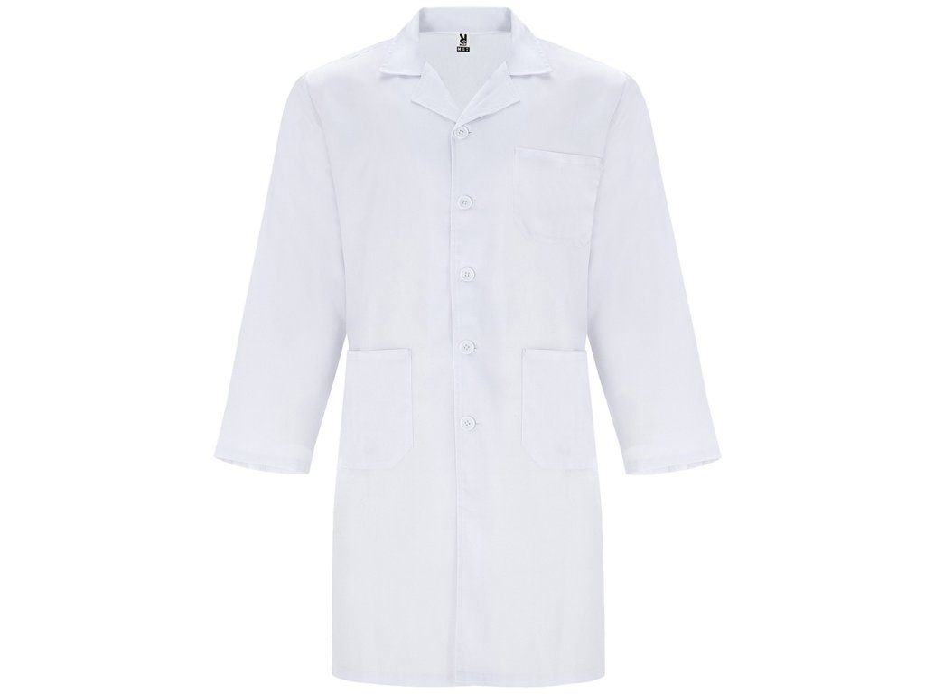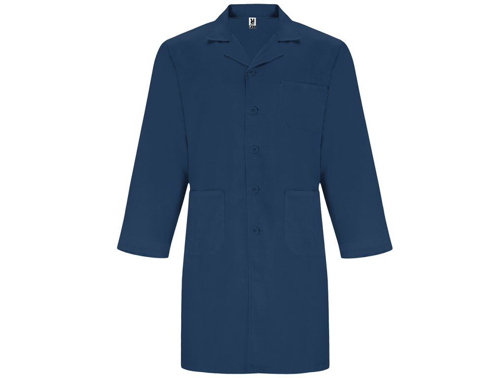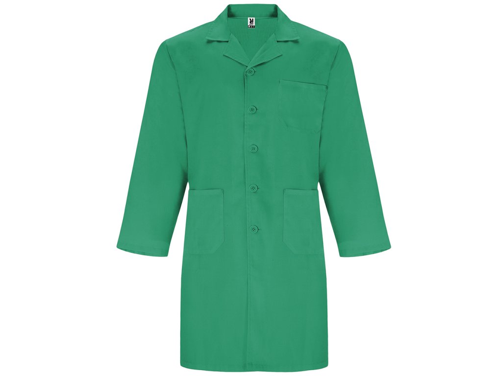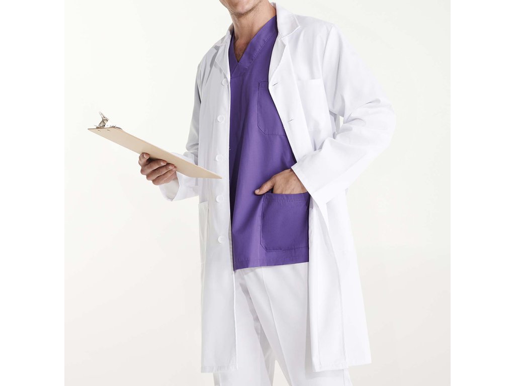 Pánský pracovní plášť Vaccine, který má límec s klopou, středové zapínání na 5 knoflíků ve stejné barvě plaště, náprsní kapsu, dvě postranní kapsy a pásek vzadu.