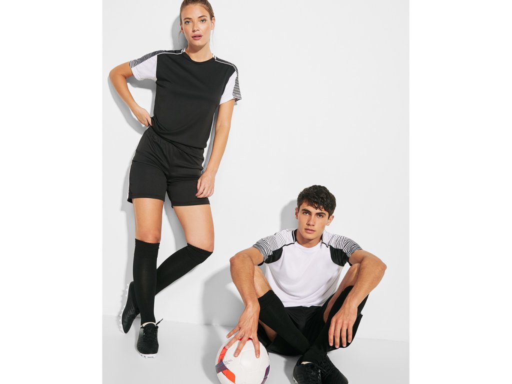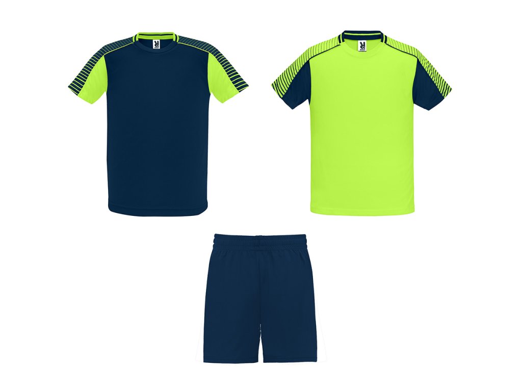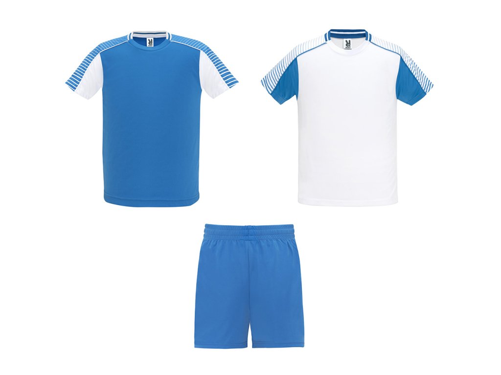 Sportovní souprava unisex. Obsahuje 2 trička a 1 kraťasy. Tričko s raglánovým rukávem a potiskem. Kulatý výstřih s úpletem na zadní straně. Barva druhého trička je zkombinovaná opačným způsobem. Kraťasy s elastickým pasem a vnitřní šňůrkou tón v tónu a s bezpečnostním prošitím. Kontrastní postranní pruh a postranní rozparek na spodním lemu nohavice kraťas.